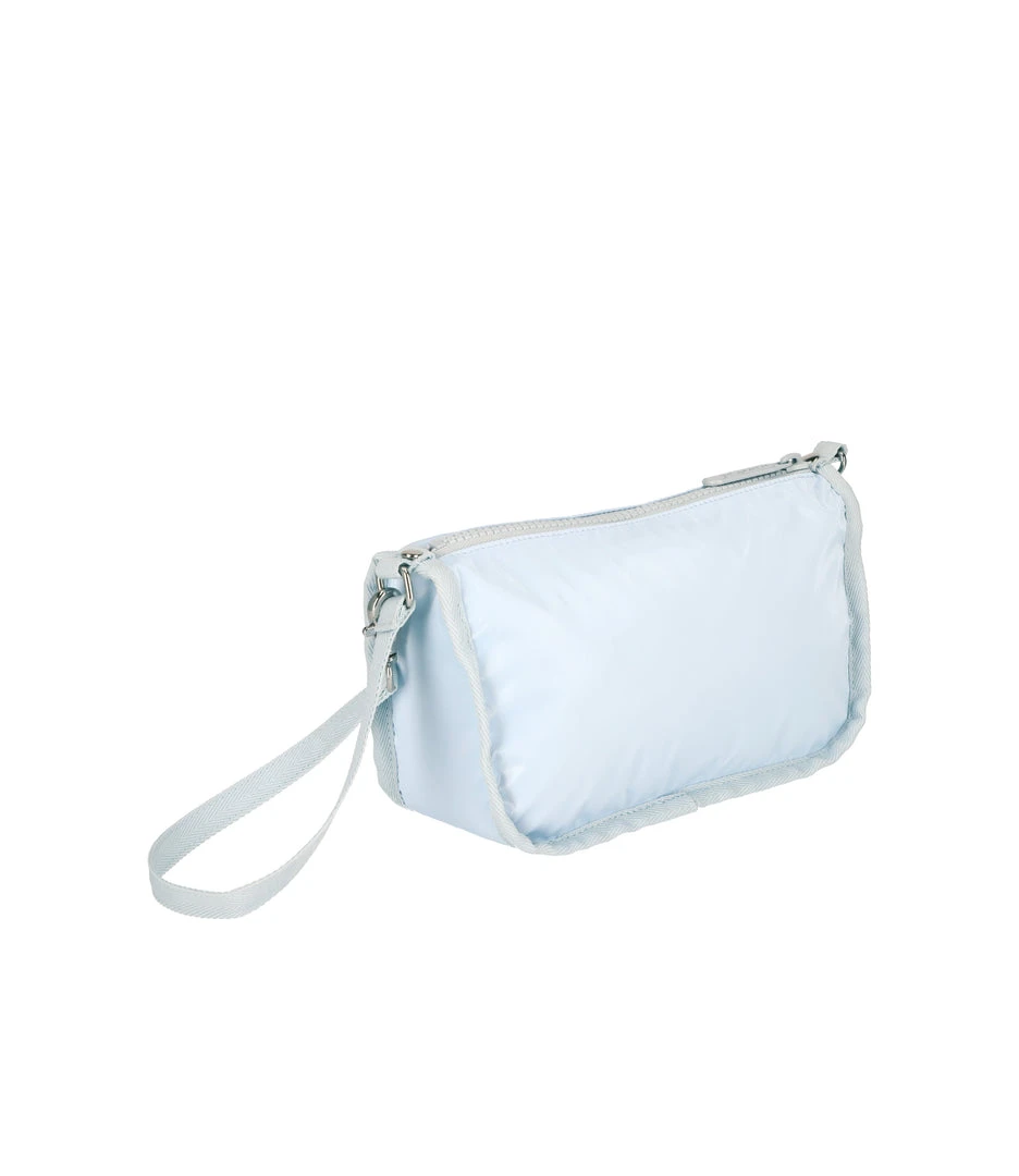Zip top main closure, Exterior front pocket with zip closure, Strap converts from a short handle (with a 6.3in/16cm drop) to a wristlet strap via a metal clip on one end