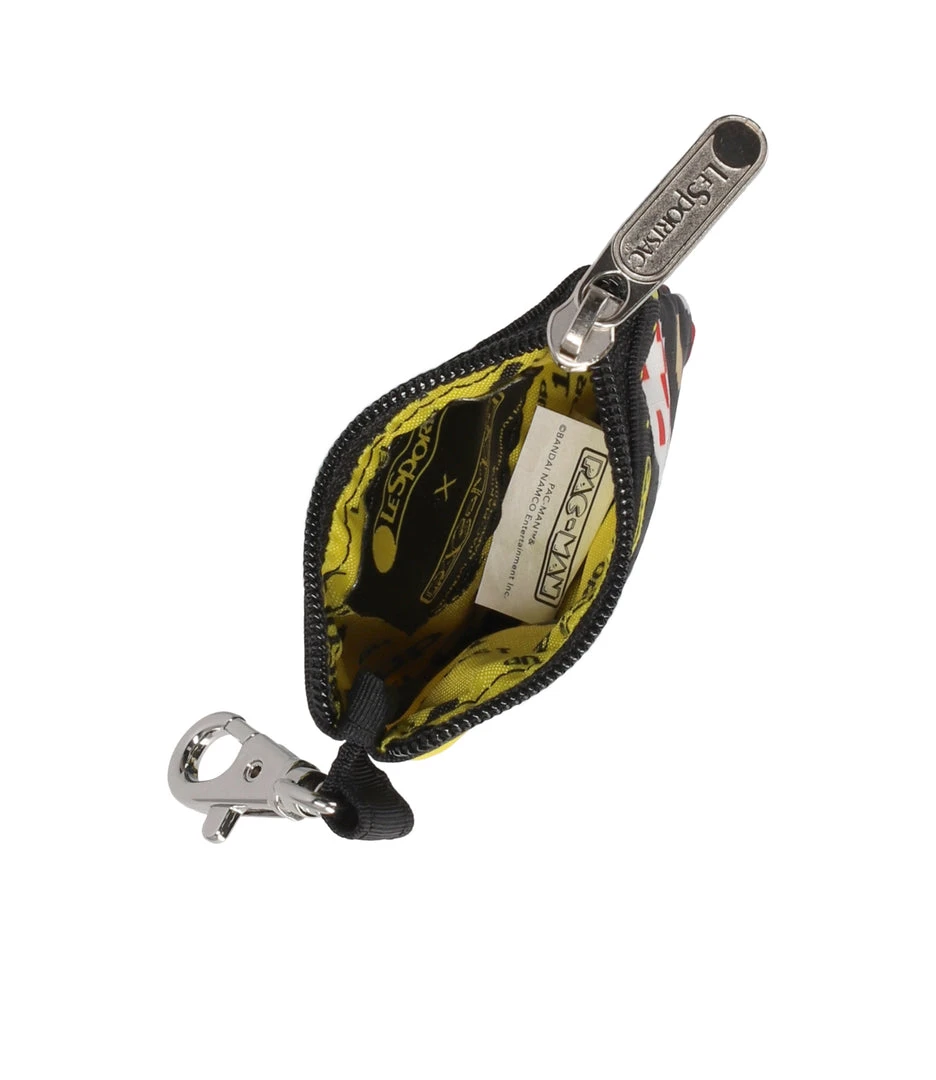 Zip main closure, webbing loop and lobster clasp at exterior left side