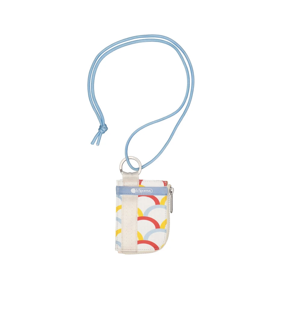 Zip around main closure, Metal key ring with lanyard cord (Drop: 19.96 inch/50cm), Exterior front open pocket, Exterior back clear ID window pocket, Interior back wall features two card pockets