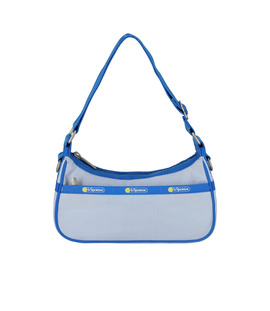 Zipped main closure, Exterior front zip pocket, Two interior back wall open pockets, Piped edges for added structure