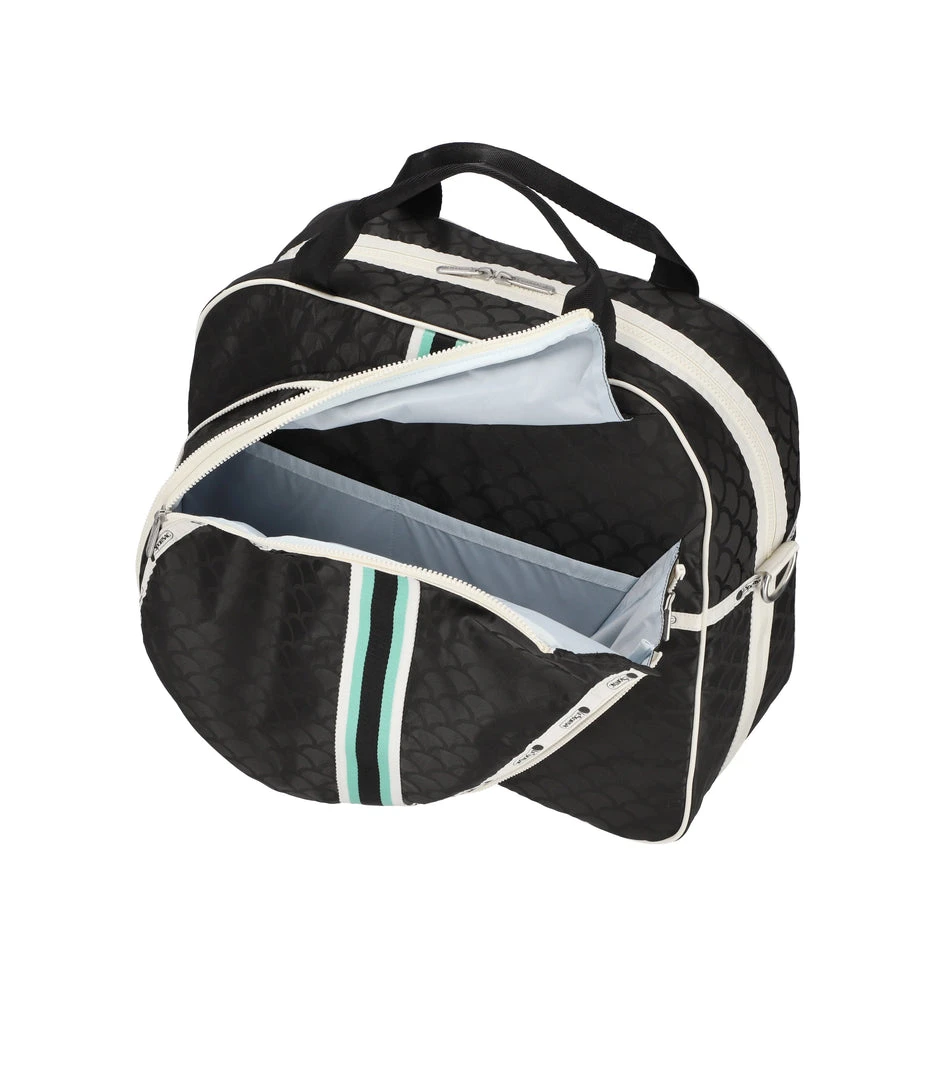 Zipped main closure with dual zipper pulls, Exterior front expandable zip tennis racquet pocket, Two exterior back panel open pockets, Interior front wall with mesh open pocket, Two interior back wall mesh open pockets, Interior side walls with mesh pockets for tennis balls or water bottle, 1.5in/3.8cm wide pinched top handles (Drop: 4 in/10cm, Length: 13.98 in/ 35.5cm, 1.5in/3.8cm wide adjustable/detachable shoulder strap with logo grosgrain details (Max length: 42.12 in/107 cm, Min length: 24.6 in/62.5 cm)
