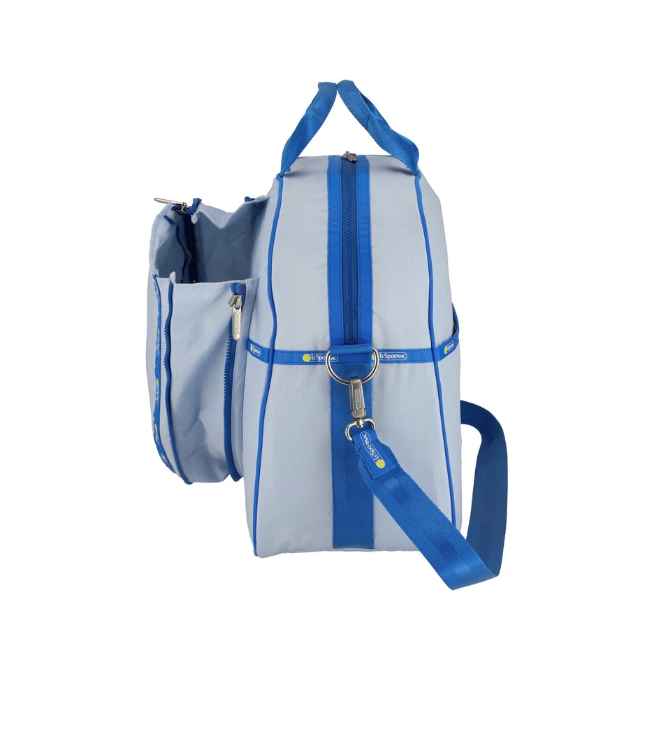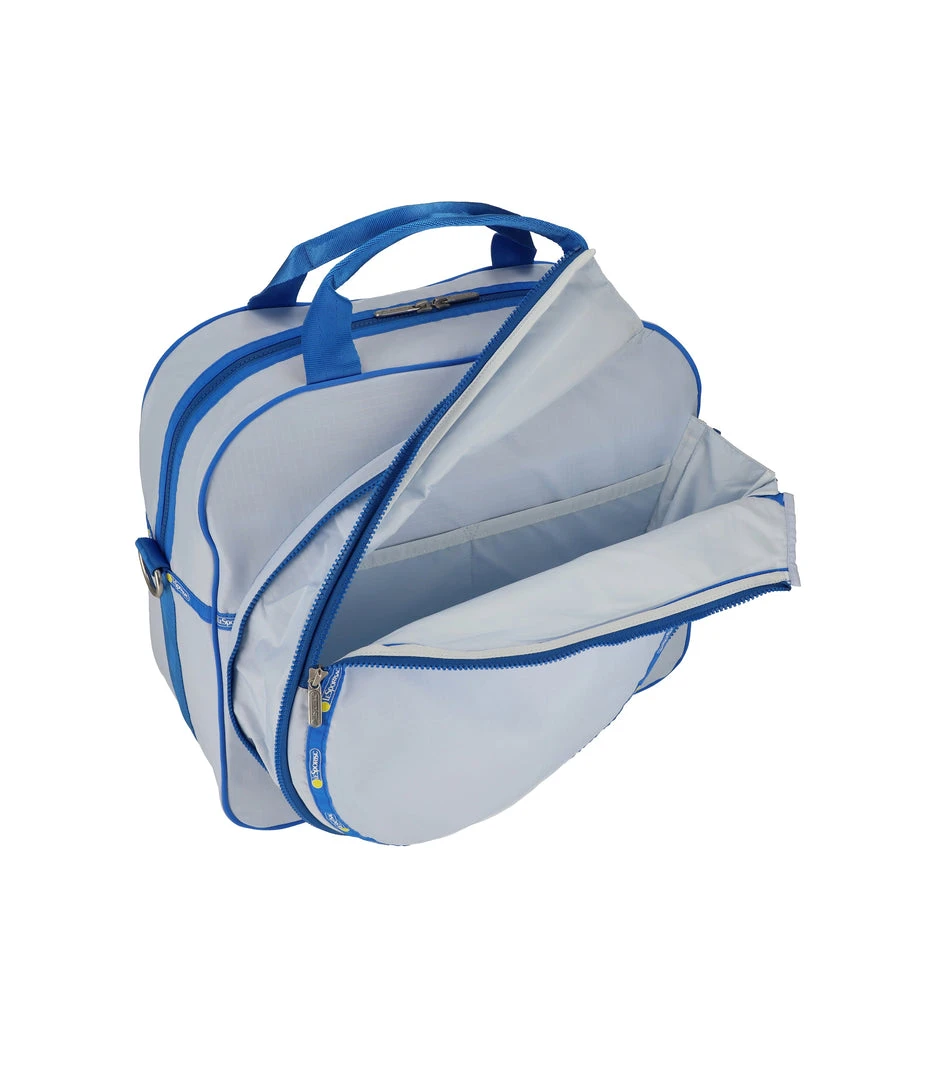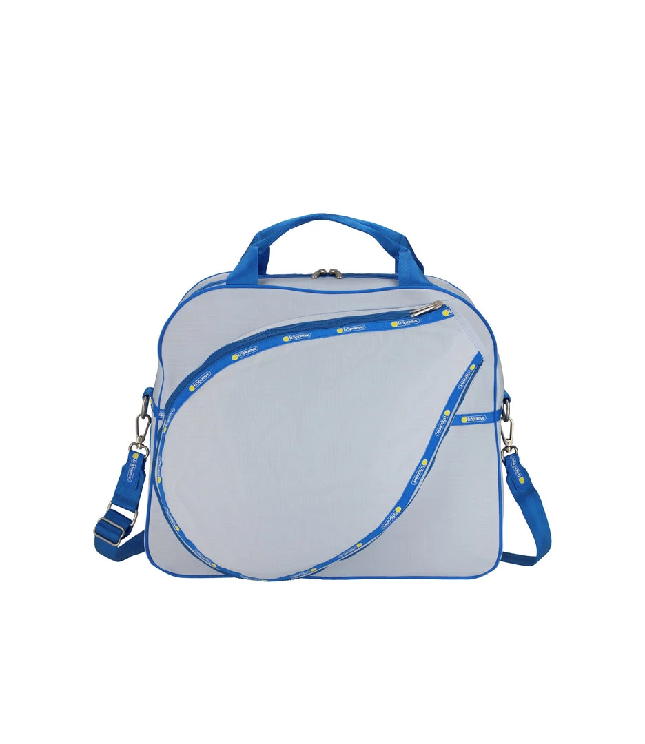 Zipped main closure with dual zipper pulls, Exterior front expandable zip tennis racquet pocket, Exterior back open pocket, Interior front wall with mesh open pocket, Two interior back wall mesh open pockets, Interior side walls with mesh pockets for tennis balls or water bottle, 1.5in/3.8cm wide pinched top handles (Drop: 4 in/10cm, Length: 13.98 in/ 35.5cm, 1.5in/3.8cm wide adjustable/detachable shoulder strap with logo grosgrain details (Max length: 42.12 in/107 cm, Min length: 24.6 in/62.5 cm)