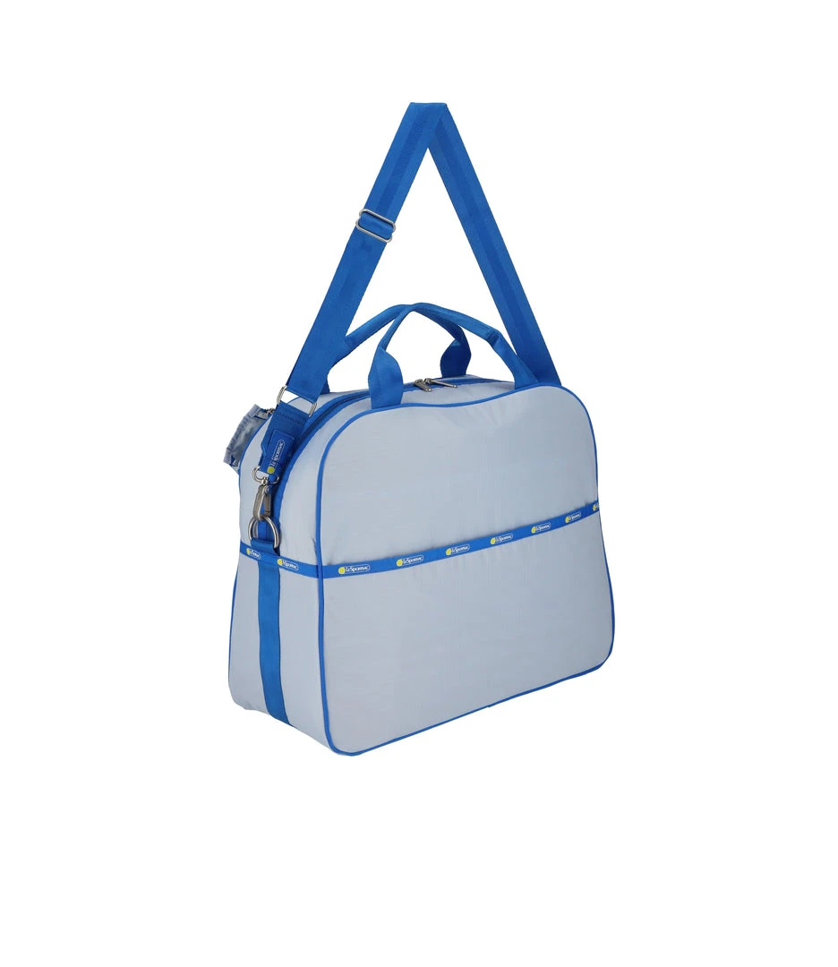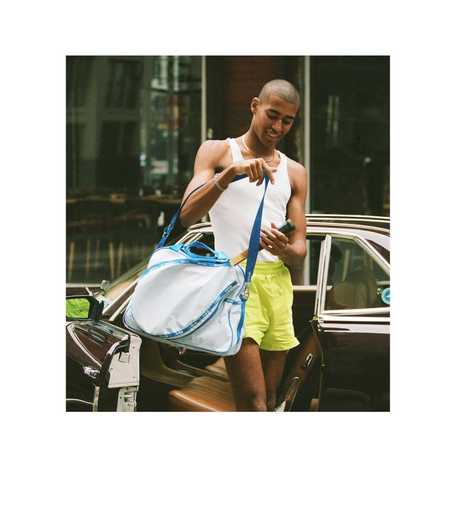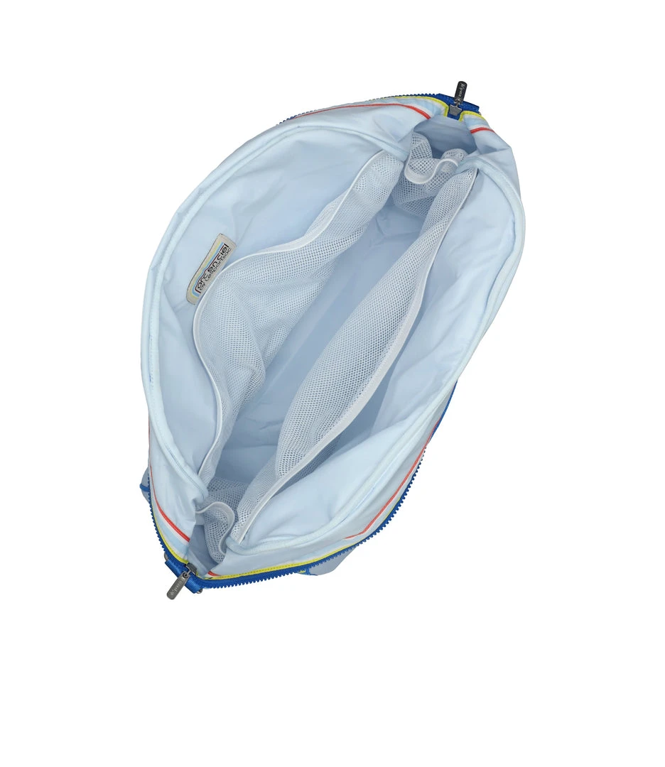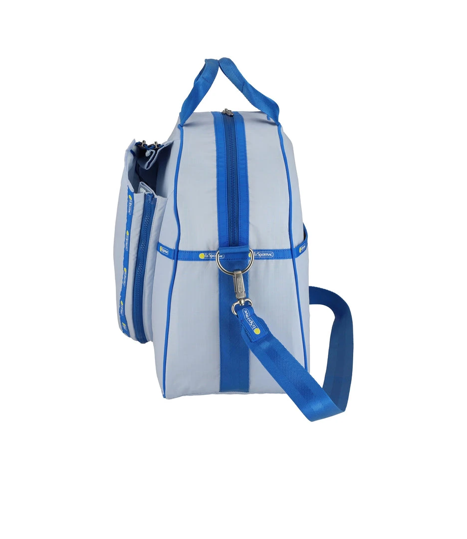 Zipped main closure with dual zipper pulls, Exterior front expandable zip tennis racquet pocket, Exterior back open pocket, Interior front wall with mesh open pocket, Two interior back wall mesh open pockets, Interior side walls with mesh pockets for tennis balls or water bottle, 1.5in/3.8cm wide pinched top handles (Drop: 4 in/10cm, Length: 13.98 in/ 35.5cm, 1.5in/3.8cm wide adjustable/detachable shoulder strap with logo grosgrain details (Max length: 42.12 in/107 cm, Min length: 24.6 in/62.5 cm)