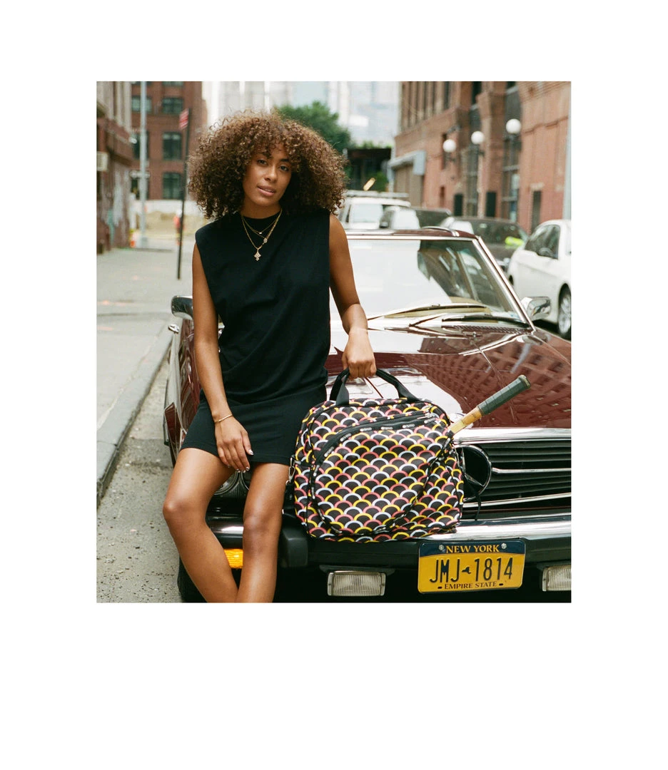 Zipped main closure with dual zipper pulls, Exterior front expandable zip tennis racquet pocket, Exterior back open pocket, Interior front wall with mesh open pocket, Two interior back wall mesh open pockets, Interior side walls with mesh pockets for tennis balls or water bottle, 1.5in/3.8cm wide pinched top handles (Drop: 4 in/10cm, Length: 13.98 in/ 35.5cm, 1.5in/3.8cm wide adjustable/detachable shoulder strap with logo grosgrain details (Max length: 42.12 in/107 cm, Min length: 24.6 in/62.5 cm)