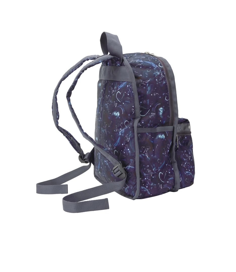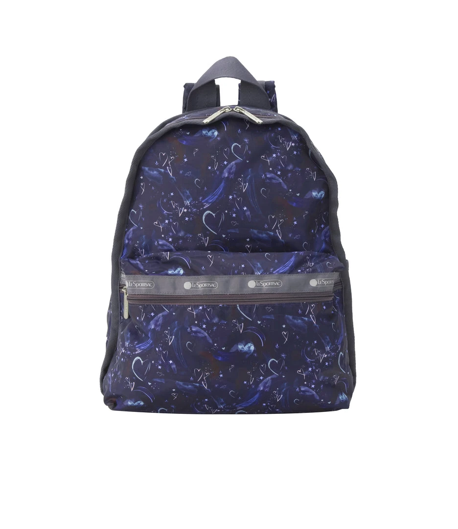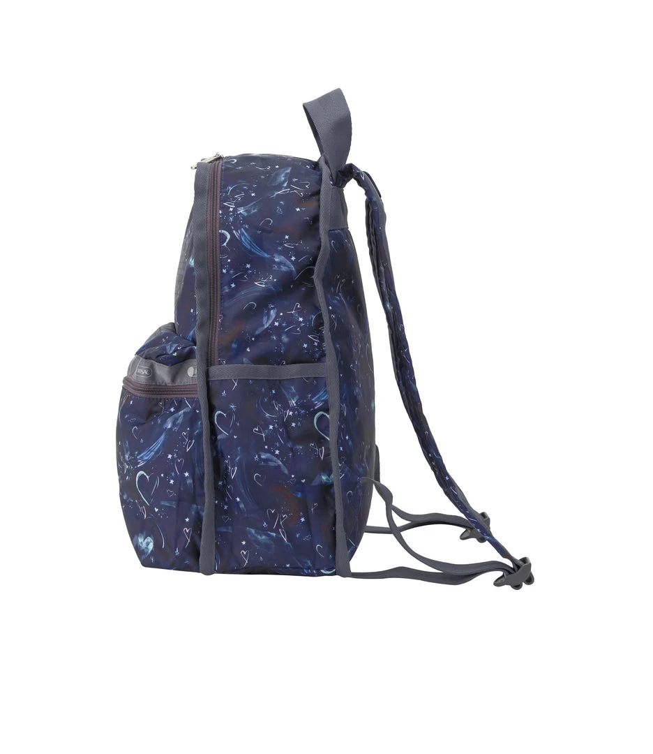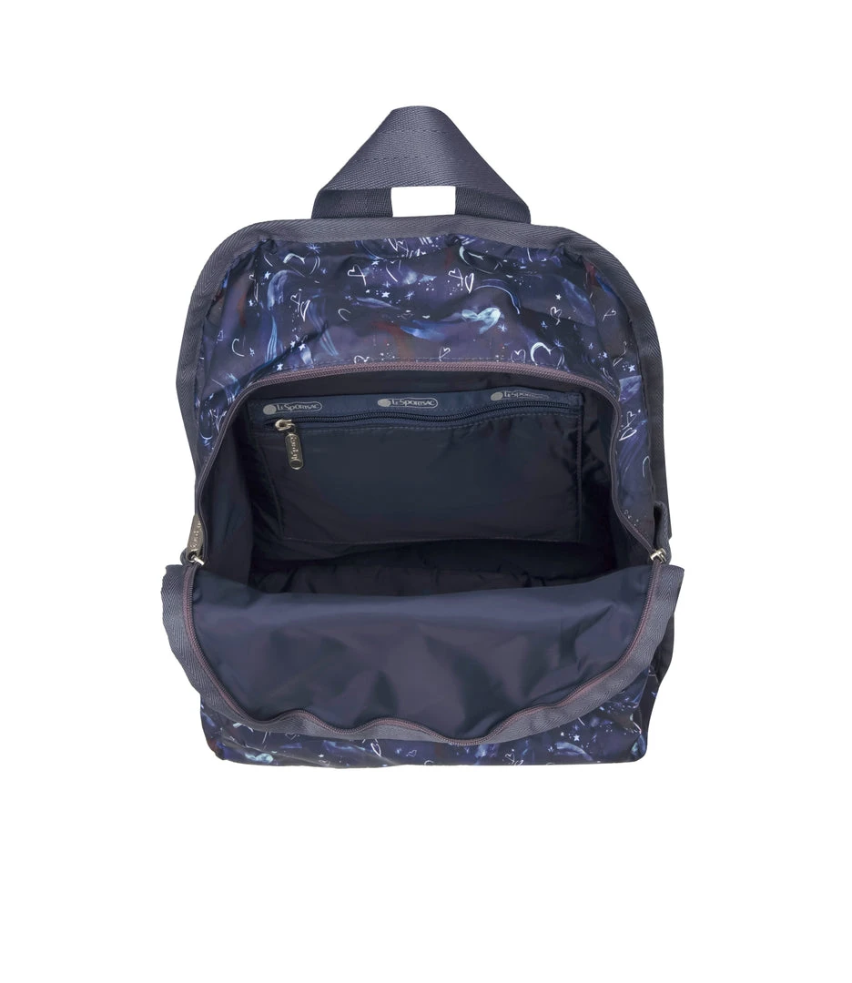 Zip main closure, Exterior front pocket with zip closure, Two exterior side open top pockets, Top loop, Lightly padded back and bottom, Lightly padded adjustable shoulder straps, Interior back wall signature zip/open pocket