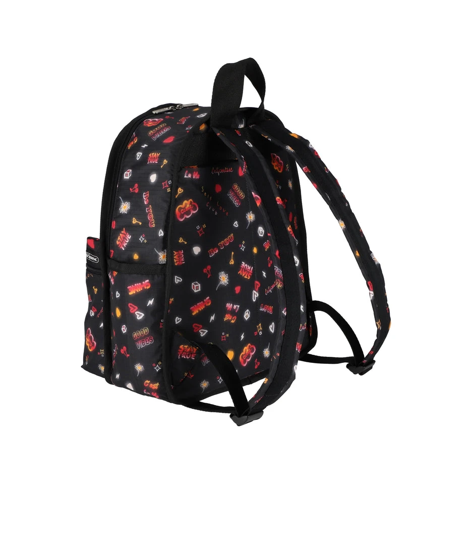 Zip main closure, Exterior front pocket with zip closure, Two exterior side open top pockets, Top loop, Lightly padded back and bottom, Lightly padded adjustable shoulder straps, Interior back wall signature zip/open pocket
