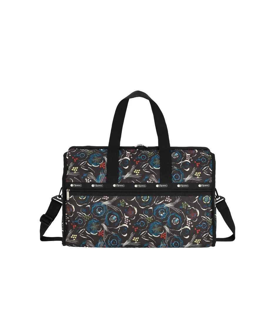 Zip main closure with dual zipper pulls, 8.5in (21.59cm) Top handle drop, 1.5in (3.81cm) Wide adjustable/detachable crossbody strap (Max. 42in/106.68cm), Exterior front panel zipper pocket, Exterior back panel zip closure pocket with dual zipper pulls and a bottom zipper to convert pocket into a sleeve (to slide over rolling luggage handles), Two exterior side pockets with zip closures, Three interior front wall open pockets, Interior back wall combination zip/open pocket
