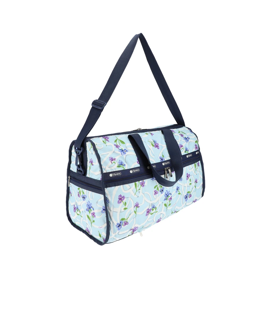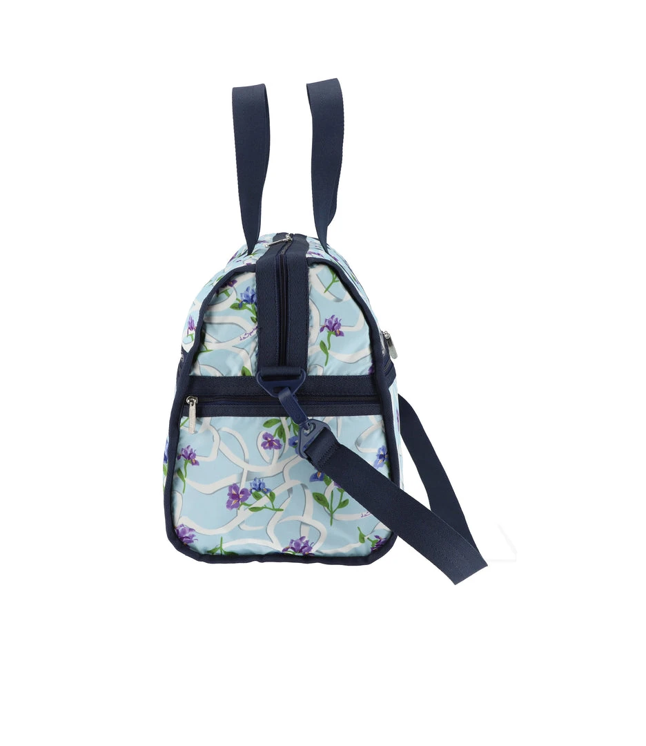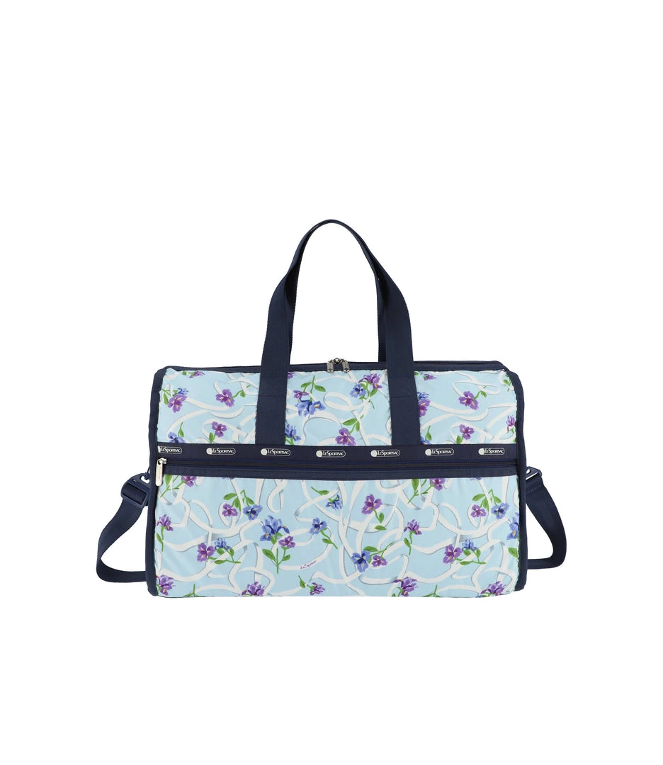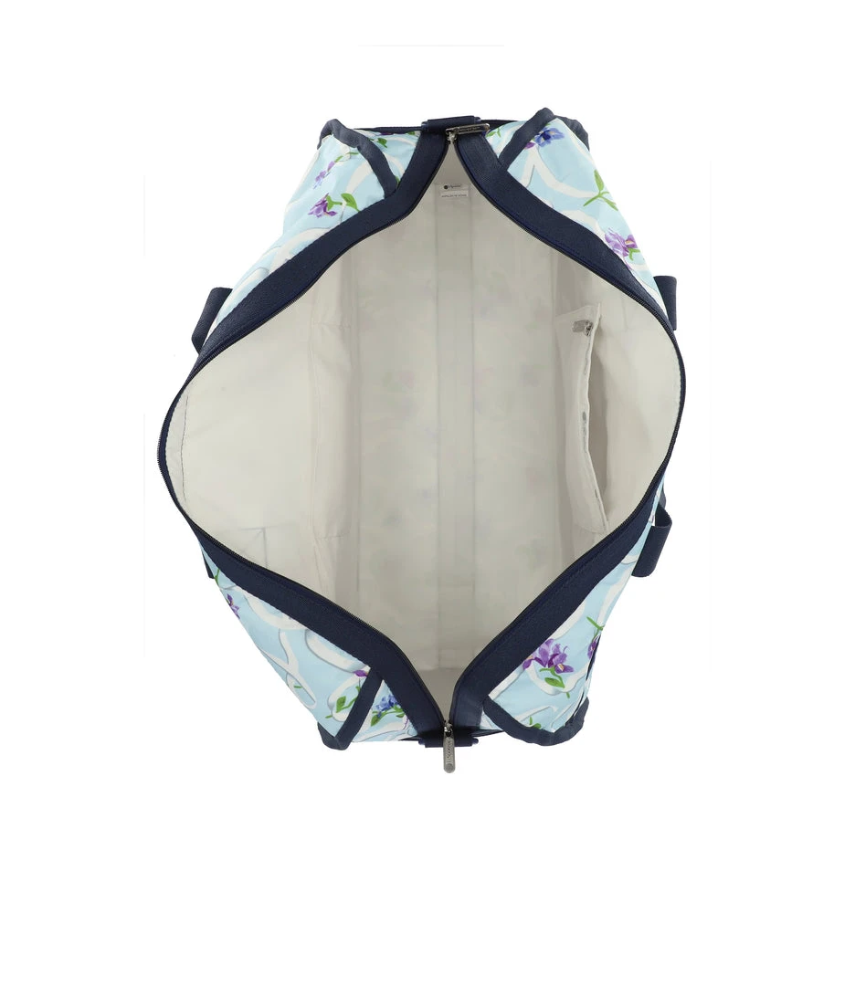 Zip main closure with dual zipper pulls, 8.5in (21.59cm) Top handle drop, 1.5in (3.81cm) Wide adjustable/detachable crossbody strap (Max. 42in/106.68cm), Exterior front panel zipper pocket, Exterior back panel zip closure pocket with dual zipper pulls and a bottom zipper to convert pocket into a sleeve (to slide over rolling luggage handles), Two exterior side pockets with zip closures, Three interior front wall open pockets, Interior back wall combination zip/open pocket