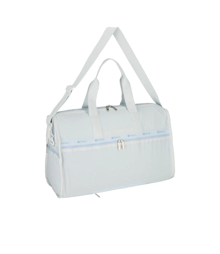Zip main closure with dual zipper pulls, 8.5in (21.59cm) Top handle drop, 1.5in (3.81cm) Wide adjustable/detachable crossbody strap (Max. 42in/106.68cm), Exterior front panel zipper pocket, Exterior back panel zip closure pocket with dual zipper pulls and a bottom zipper to convert pocket into a sleeve (to slide over rolling luggage handles), Two exterior side pockets with zip closures, Three interior front wall open pockets, Interior back wall combination zip/open pocket