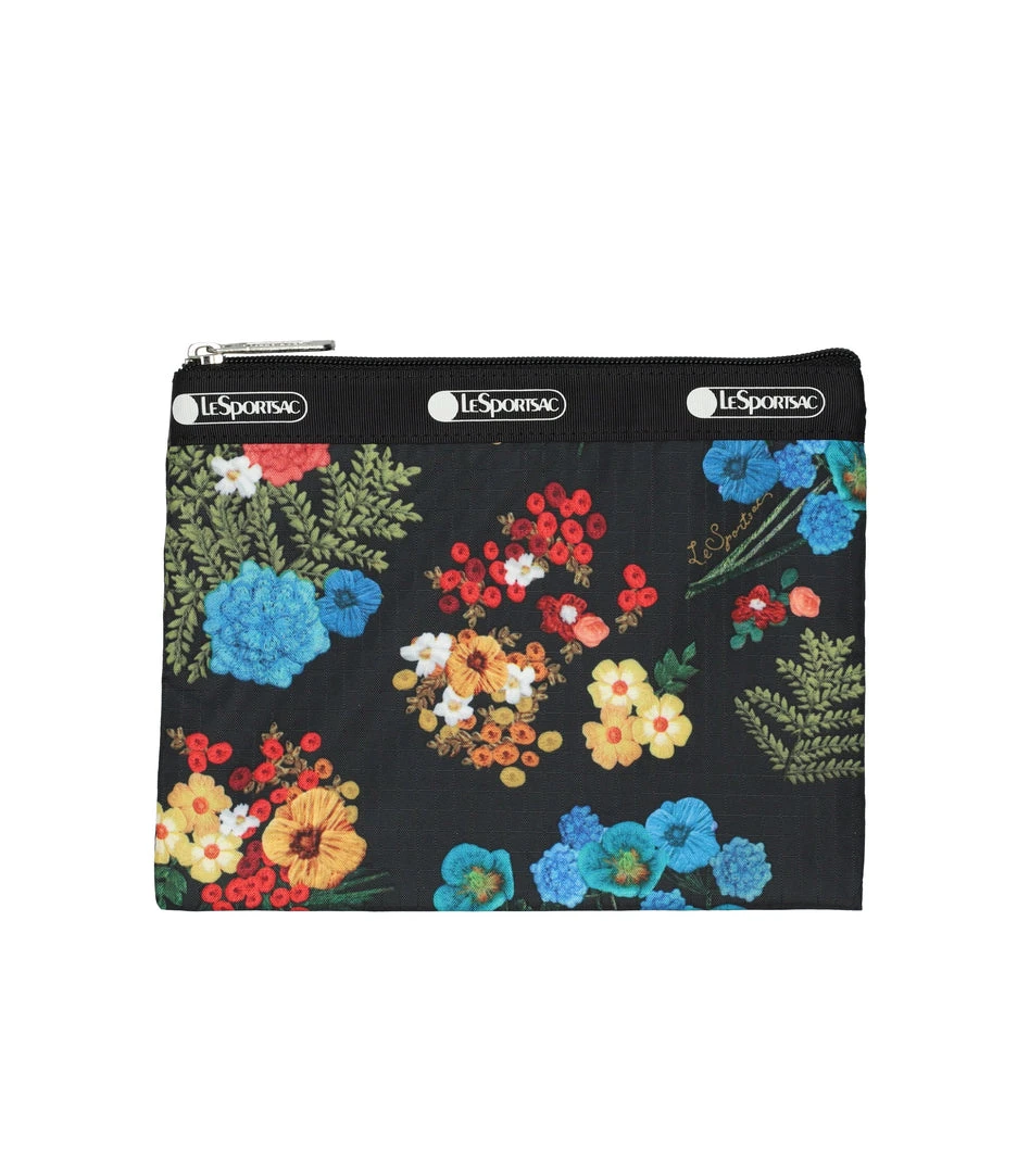 Zipped main closure, Exterior front open pocket, Exterior front pocket with zipped closure, Exterior back pocket with zipped closure, Two exterior open side pockets, Adjustable shoulder strap (Max. 52in/132cm), Interior pocket with zipped closure, Includes matching pouch with zipped closure