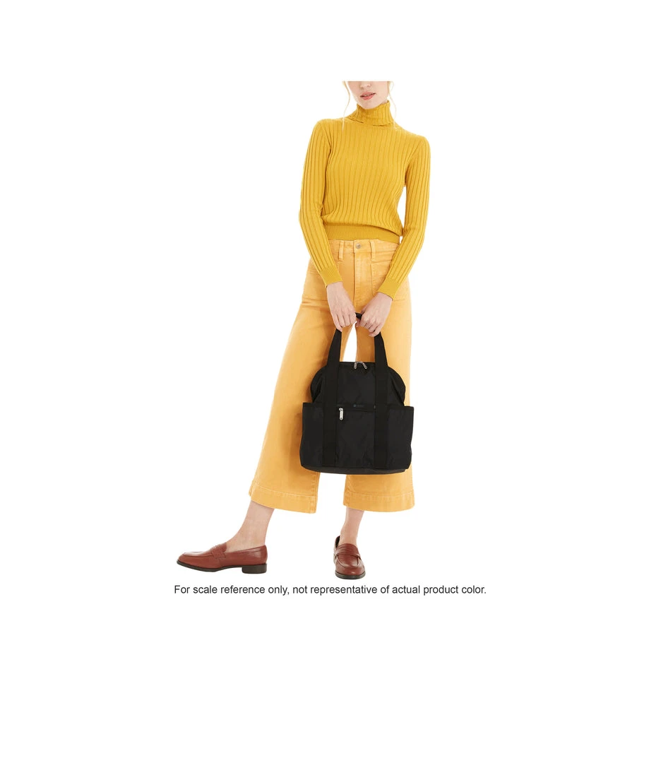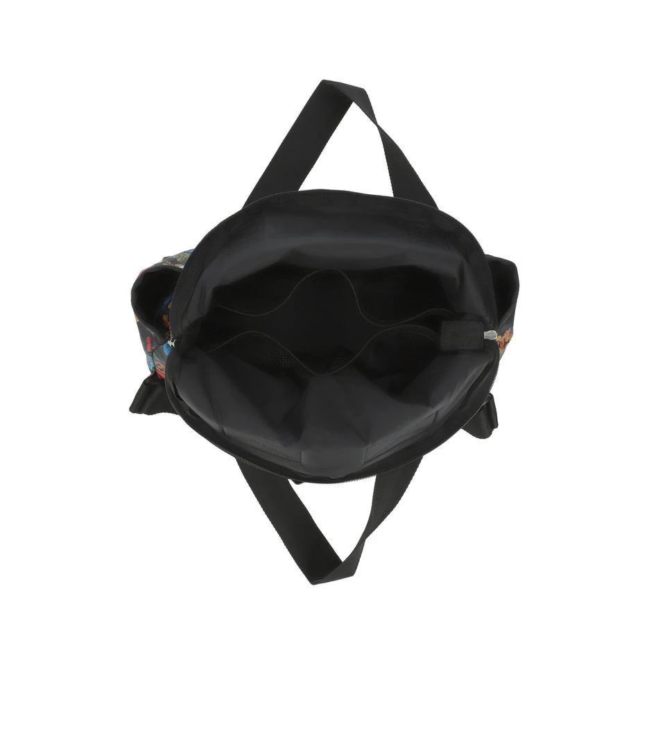 Zip top main closure with dual zipper pulls, Pinched top handles with a 6.5in (16.51cm) drop, Exterior front pocket with zip closure, Exterior front open pocket (behind zipper pocket), Two exterior side open top pockets, Exterior back panel zip closure pocket with dual zipper pulls at top and a bottom zipper (to convert pocket into a sleeve to slide over rolling luggage handles), Adjustable shoulder straps, Two interior front wall open mesh pocket, Two interior back wall open mesh pocket, Plastic hardware
