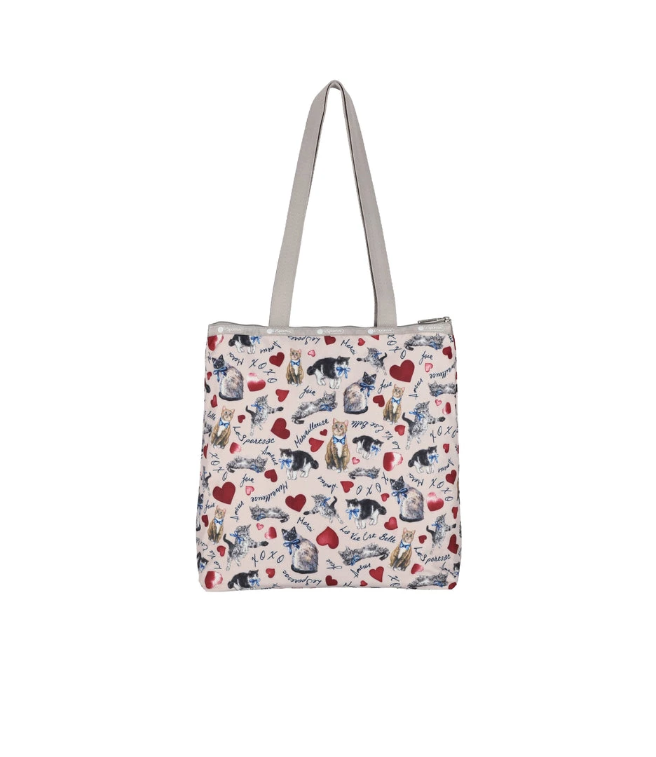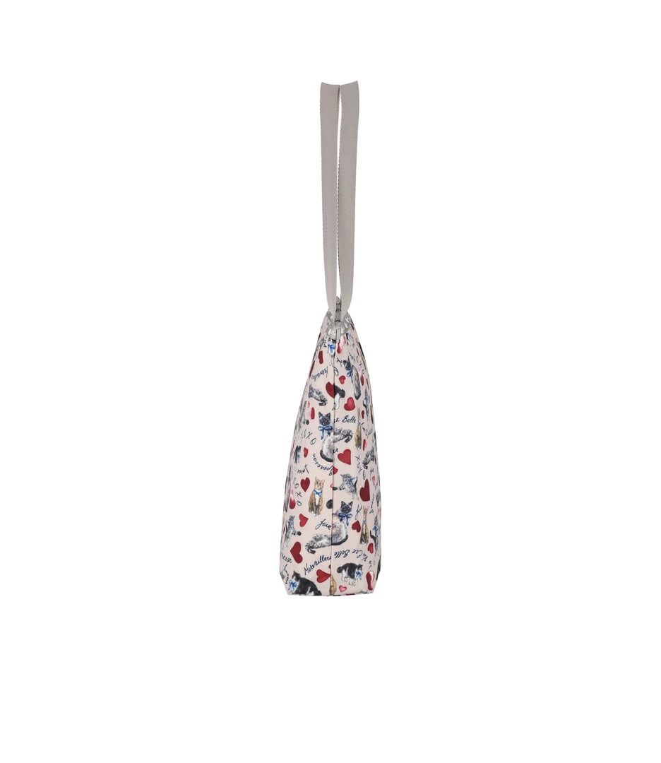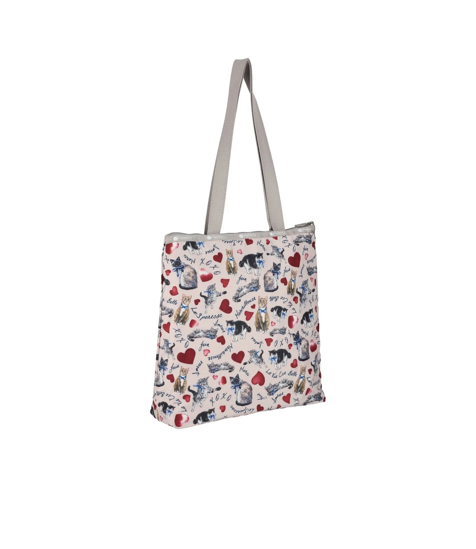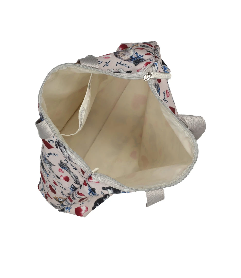 Zipped main closure, 1in (2.5cm) wide top handles (Length: 24.6 in/62.5 cm), Interior back wall combination zip/open pocket