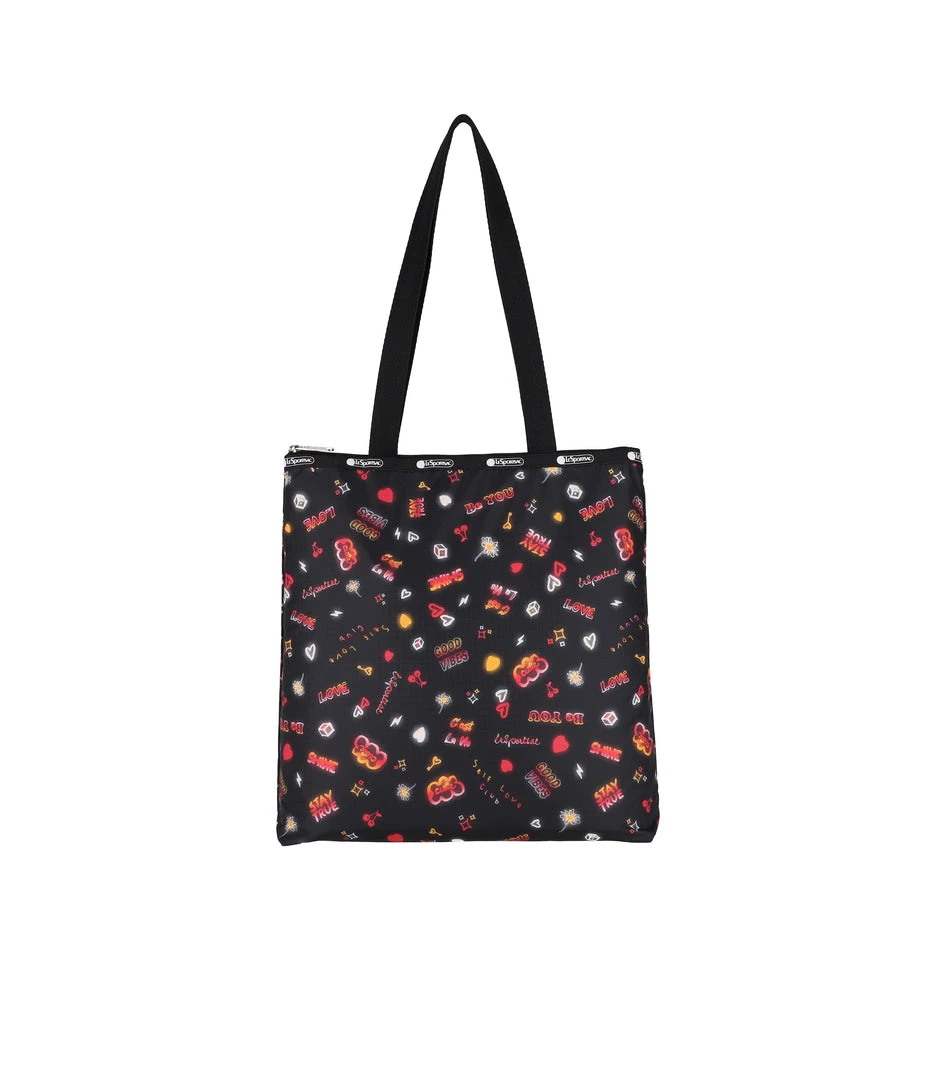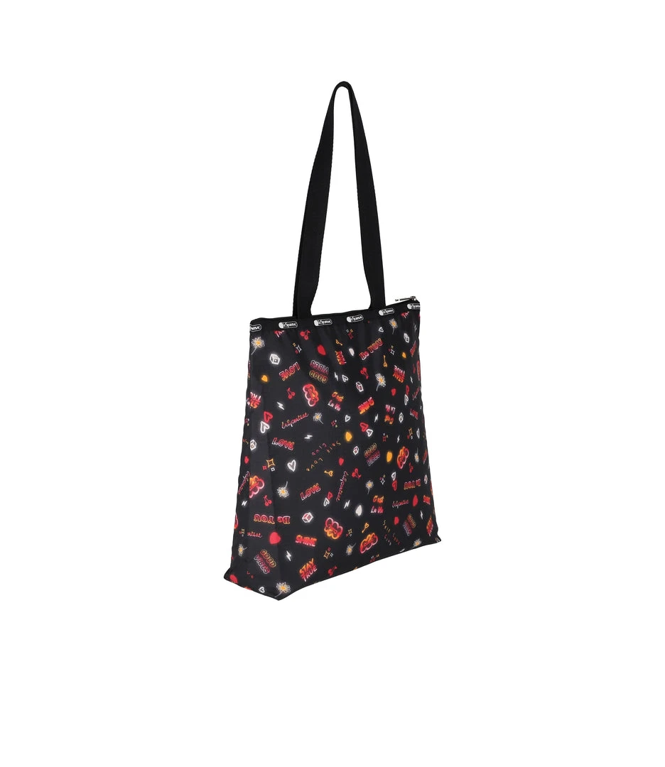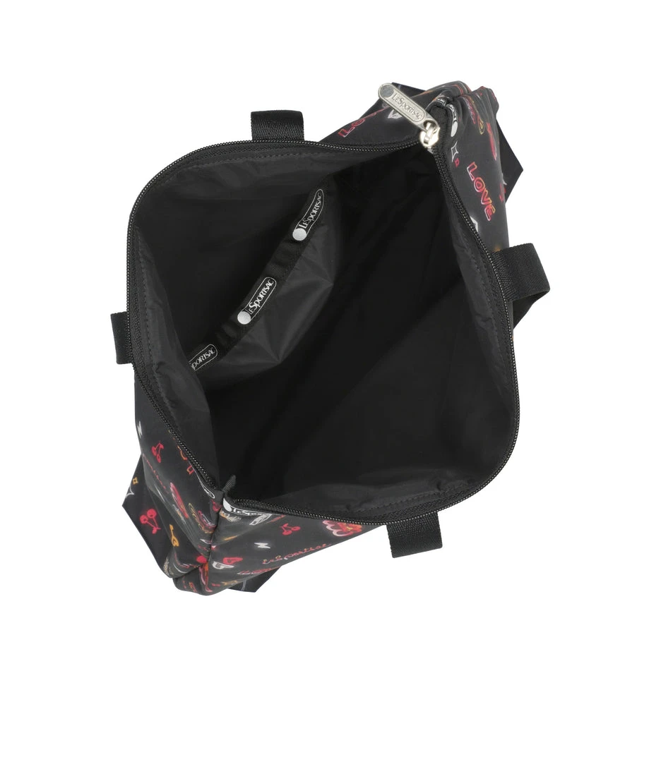 Zipped main closure, 1in (2.5cm) wide top handles (Length: 24.6 in/62.5 cm), Interior back wall combination zip/open pocket