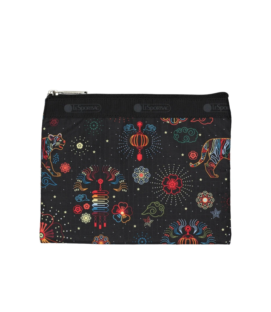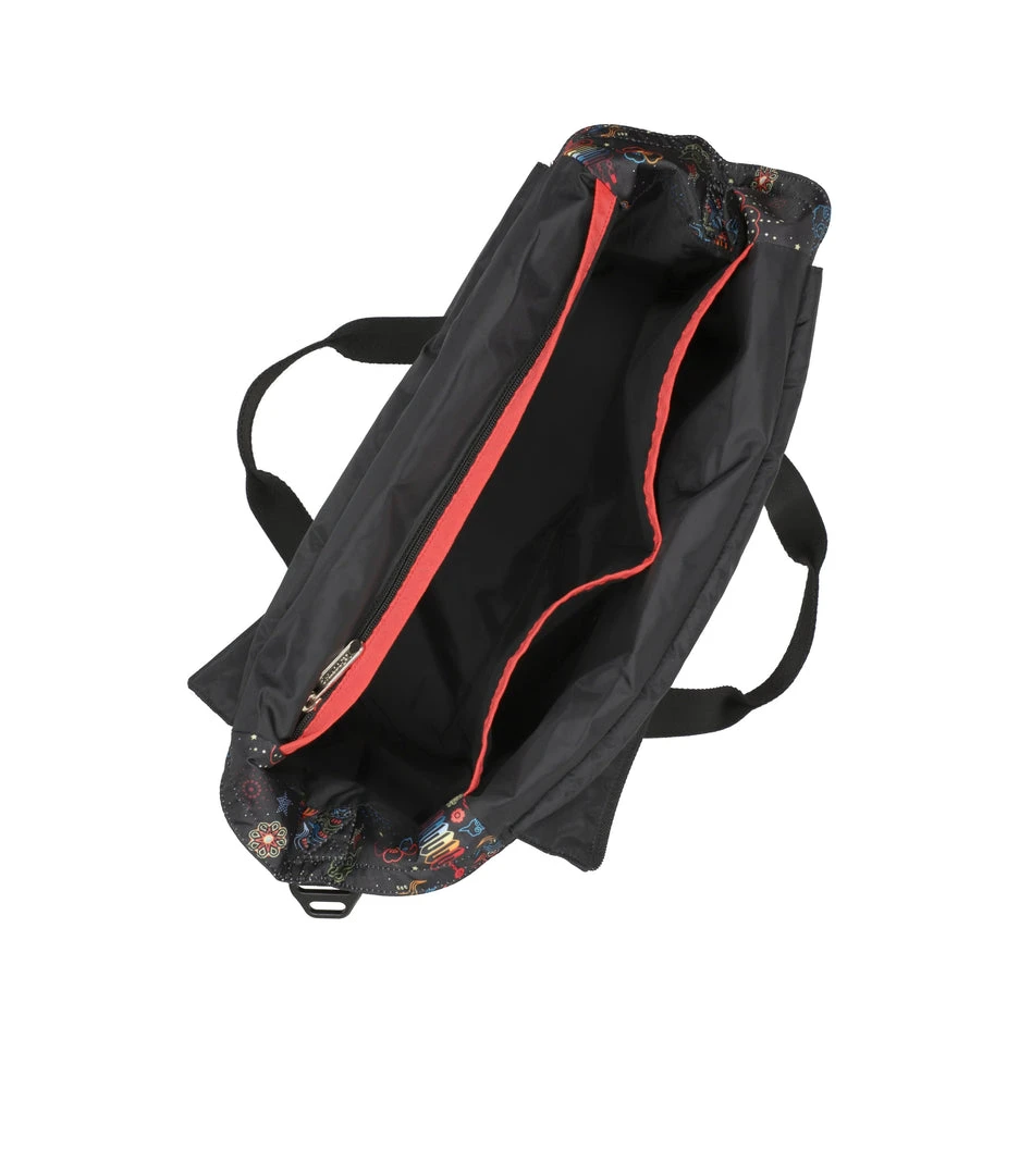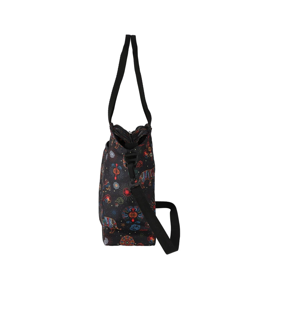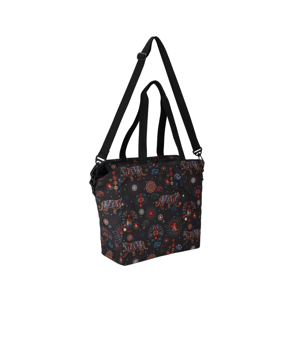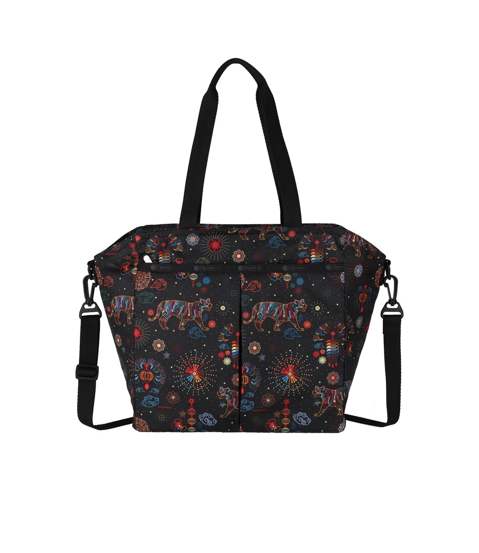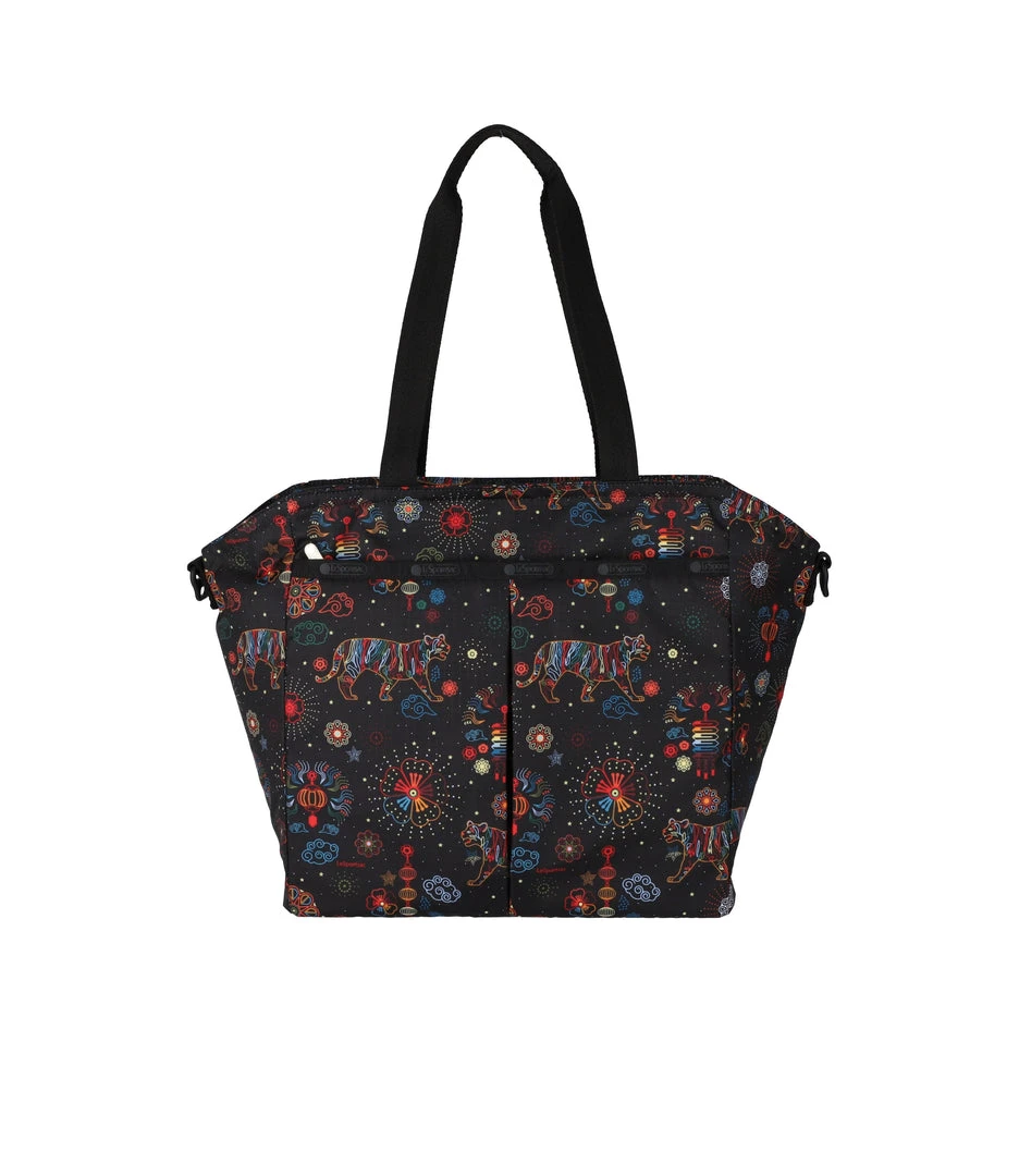 Zip top main closure, Exterior front zip closure pocket with a pleated front, Interior back wall zip closure pocket, Two interior front wall open pockets, 1in/2.5cm wide top handles (Drop: 9.5 in/24.1 cm, Length: 21 in/53.3cm), 1 in/2.5cm wide adjustable/detachable crossbody strap (Max length: 50 in/127cm, Min length: 26.4 in/67cm), Includes matching pouch with zip closure (6.1H x 7.9W in/15.5H x 20D cm)