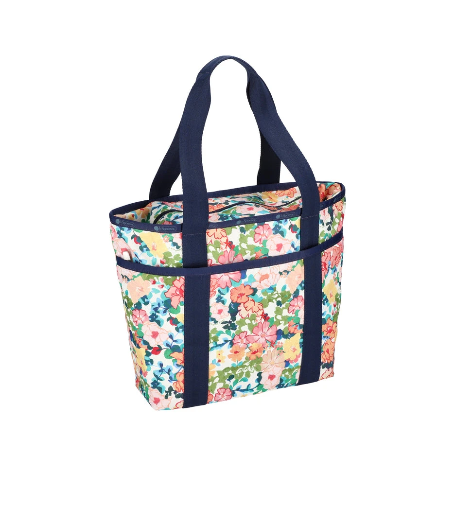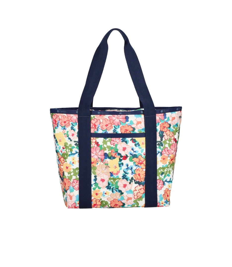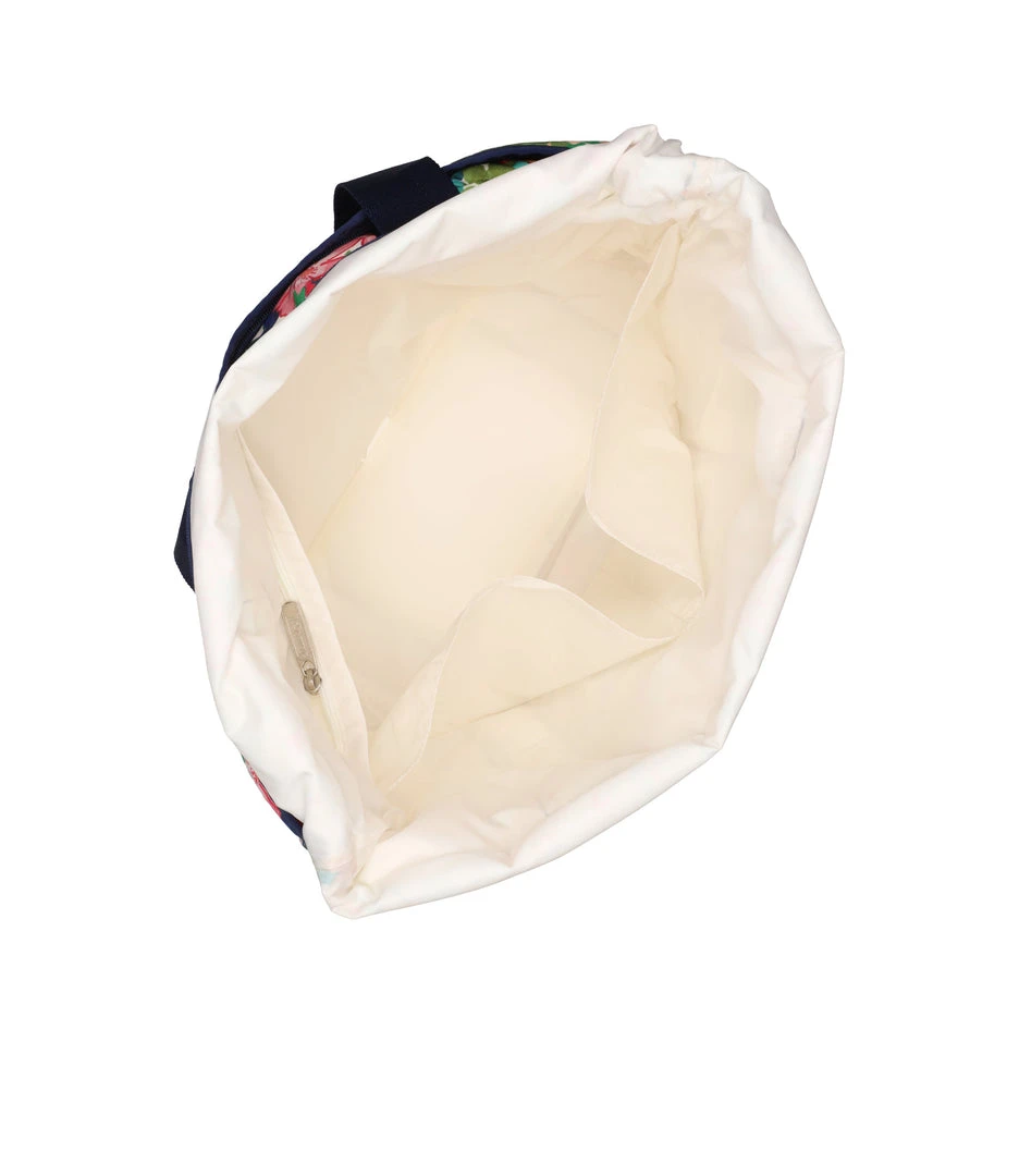 Zip top main closure, Top zipper gusset can be expanded upward for extra interior room (which adds 2in/5.1cm of vertical space), Exterior front small open pocket for phone, Exterior back full-length zip pocket, Two interior front wall open pockets, Interior back wall zip pocket, 1.5in/3.8cm wide pinched top handles (Drop: 11in/27.94cm, Length: 26.37in/67 cm)