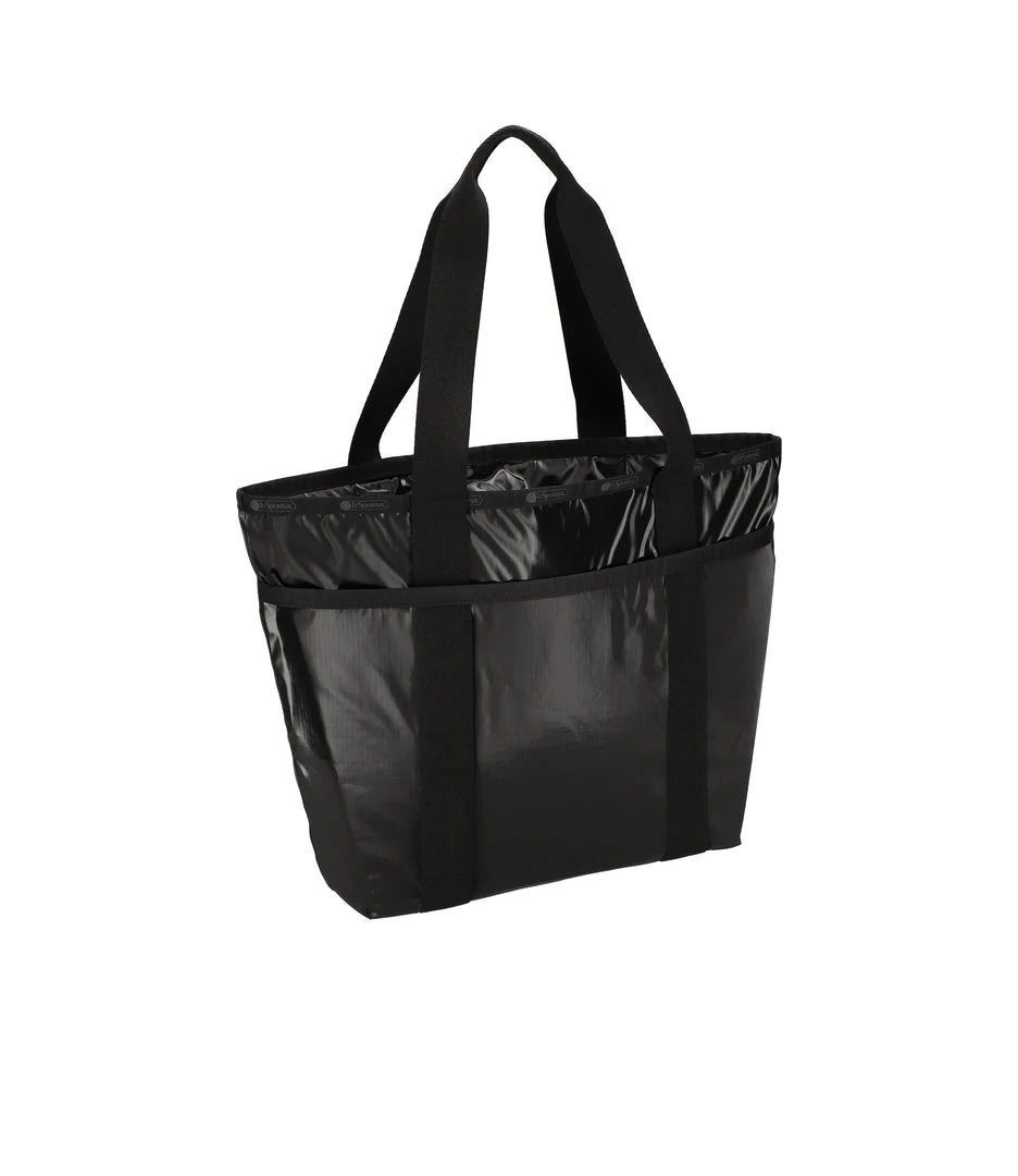 Zip main closure, Top zipper gusset can be expanded upward for extra interior room (which adds 2in/5.1cm of vertical space), Exterior front small open pocket for phone, Exterior back full-length zip pocket, Two interior front wall open pockets, Interior back wall zip pocket, 1.5in/3.8cm wide pinched top handles (Drop: 11in/27.94cm, Length: 26.37in/67 cm)