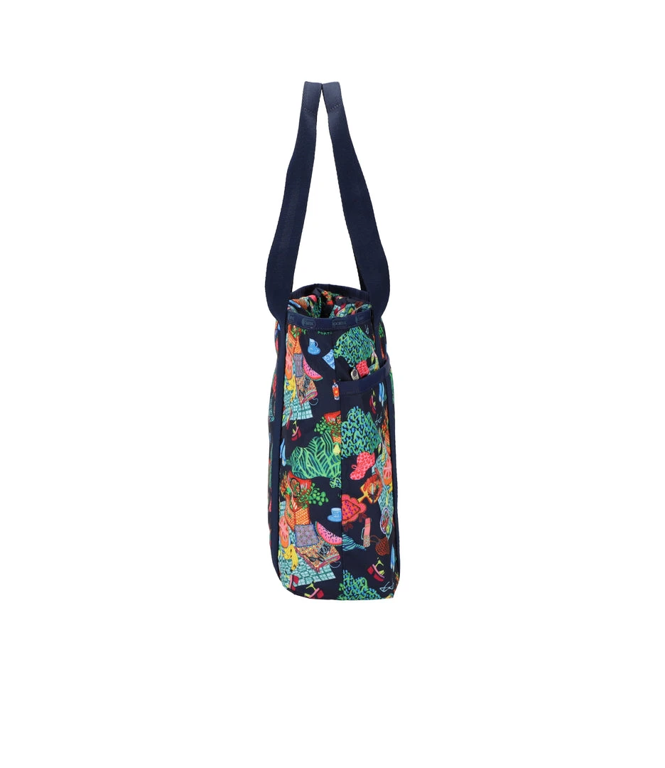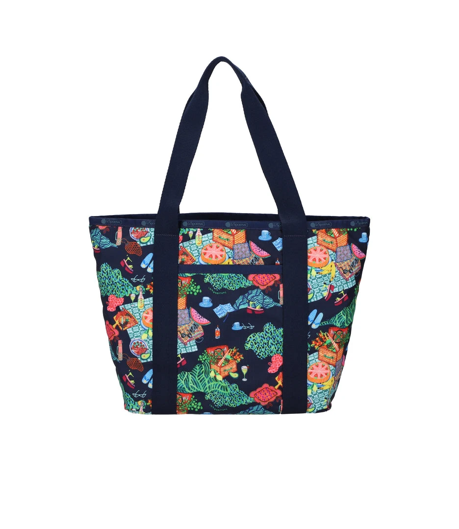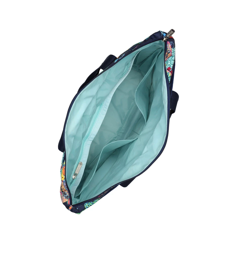Zip main closure, Top zipper gusset can be expanded upward for extra interior room (which adds 2in/5.1cm of vertical space), Exterior front small open pocket for phone, Exterior back full-length zip pocket, Two interior front wall open pockets, Interior back wall zip pocket, 1.5in/3.8cm wide pinched top handles (Drop: 11in/27.94cm, Length: 26.37in/67 cm)
