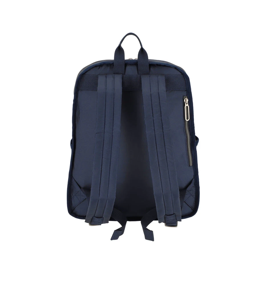 Zip main closure with dual zipper pulls, Adjustable padded shoulder straps, Two exterior front pockets with zip closures, Pinched top loop for hanging, Two exterior side open top pockets for water bottles, Exterior back small zip pocket for phone or wallet, Interior back wall padded laptop pocket with snap closure (fits laptops up to 15in), Interior front wall zip pocket