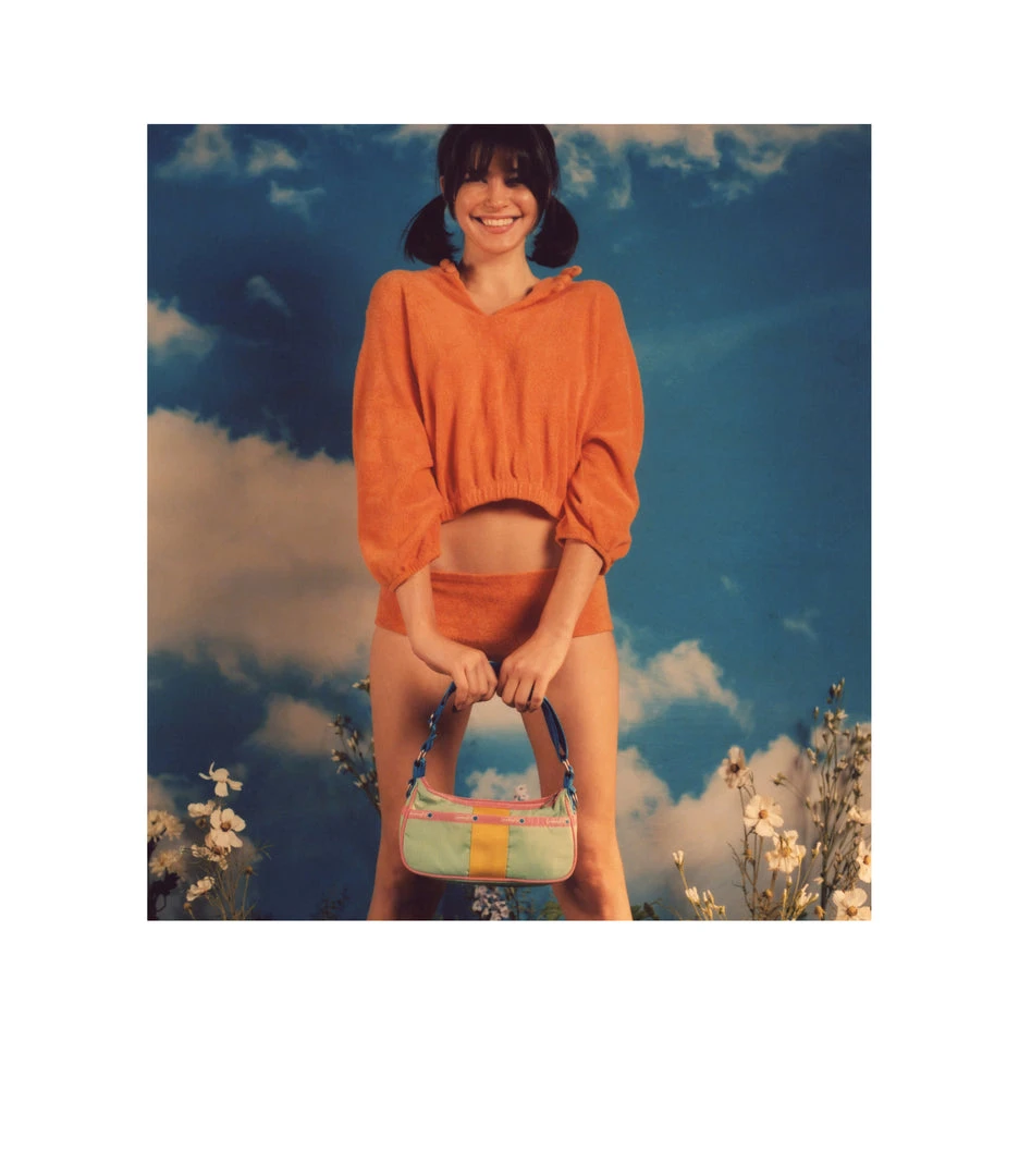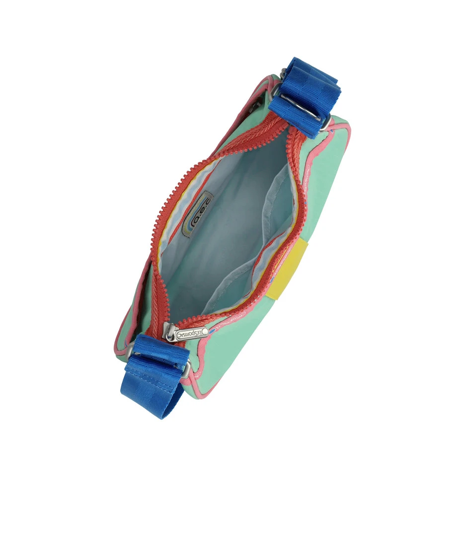 Zipped main closure, Exterior front zip pocket, Two interior back wall open pockets, Piped edges for added structure