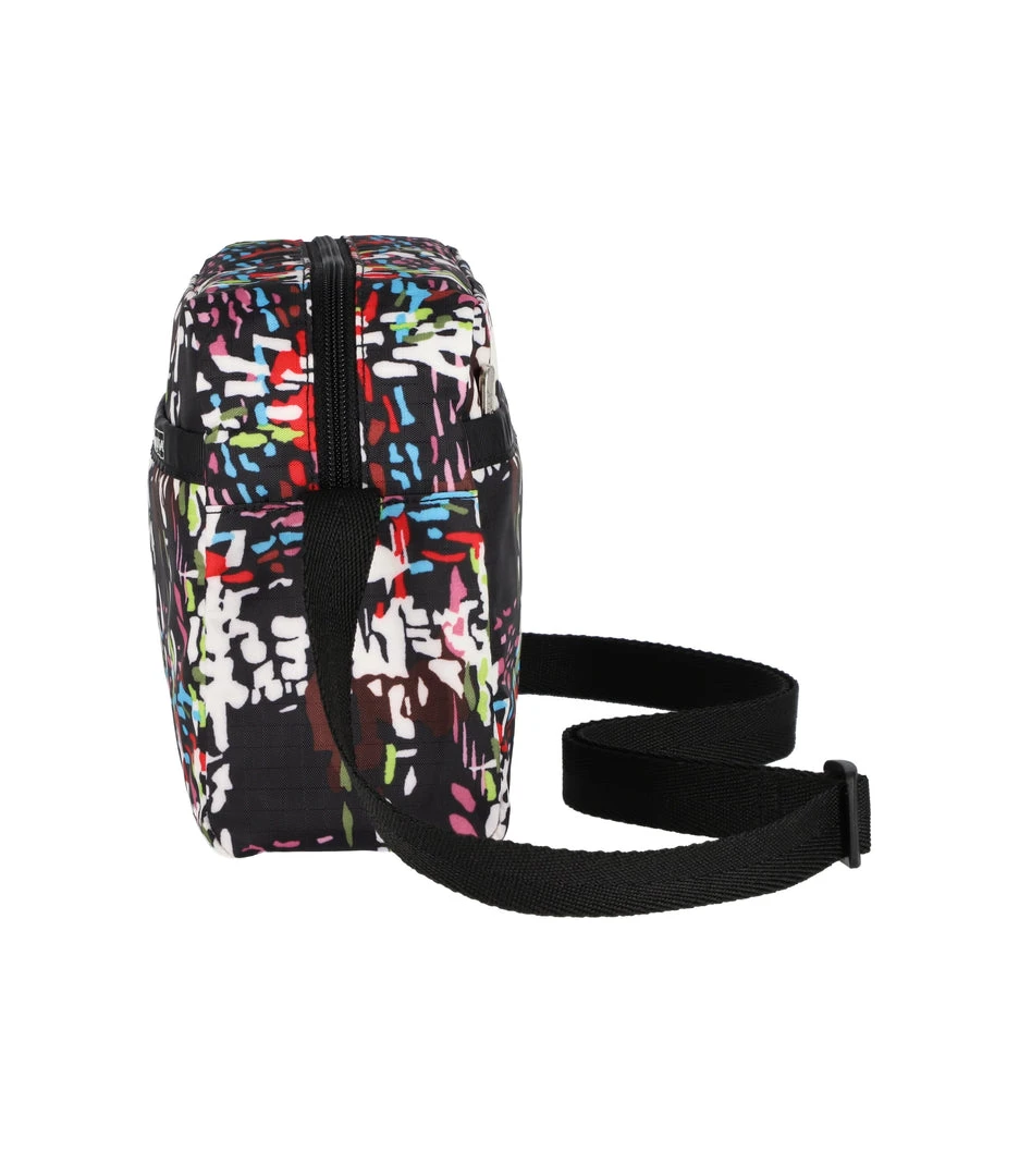 Zip top main closure, Exterior front pocket with zip closure, Exterior back pocket with zip closure, Adjustable crossbody strap (52in/132.08cm), Two interior back wall open pockets, Plastic hardware