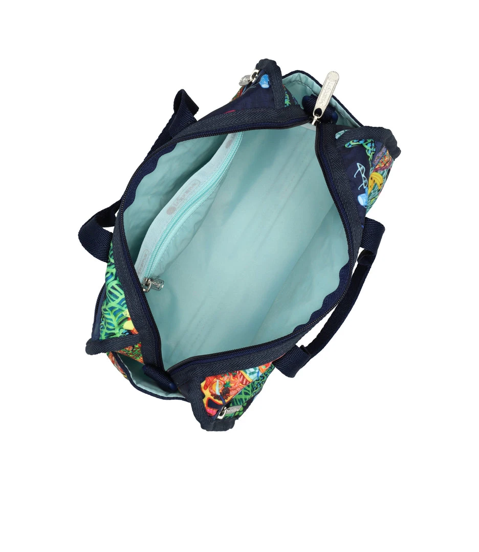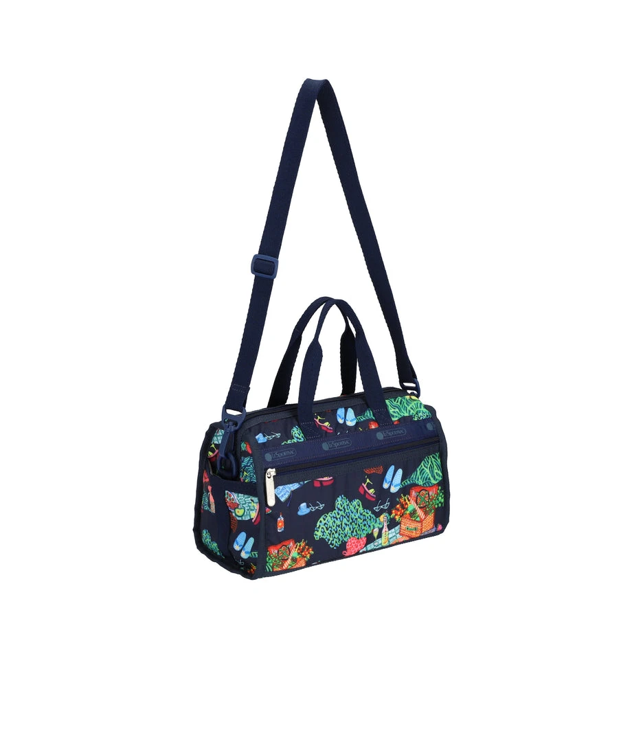 Zip main closure, Exterior front and back pockets with zip closures, Two exterior side open top pockets, 0.75 in (1.9 cm) wide top handles (Drop: 4.7 in/12 cm), 0.75 in (1.9 cm) wide adjustable/detachable shoulder strap (Max length: 50.8 in/129 cm, Min length: 26.6 in/67.5 cm), Interior back wall combination zip/open pocket