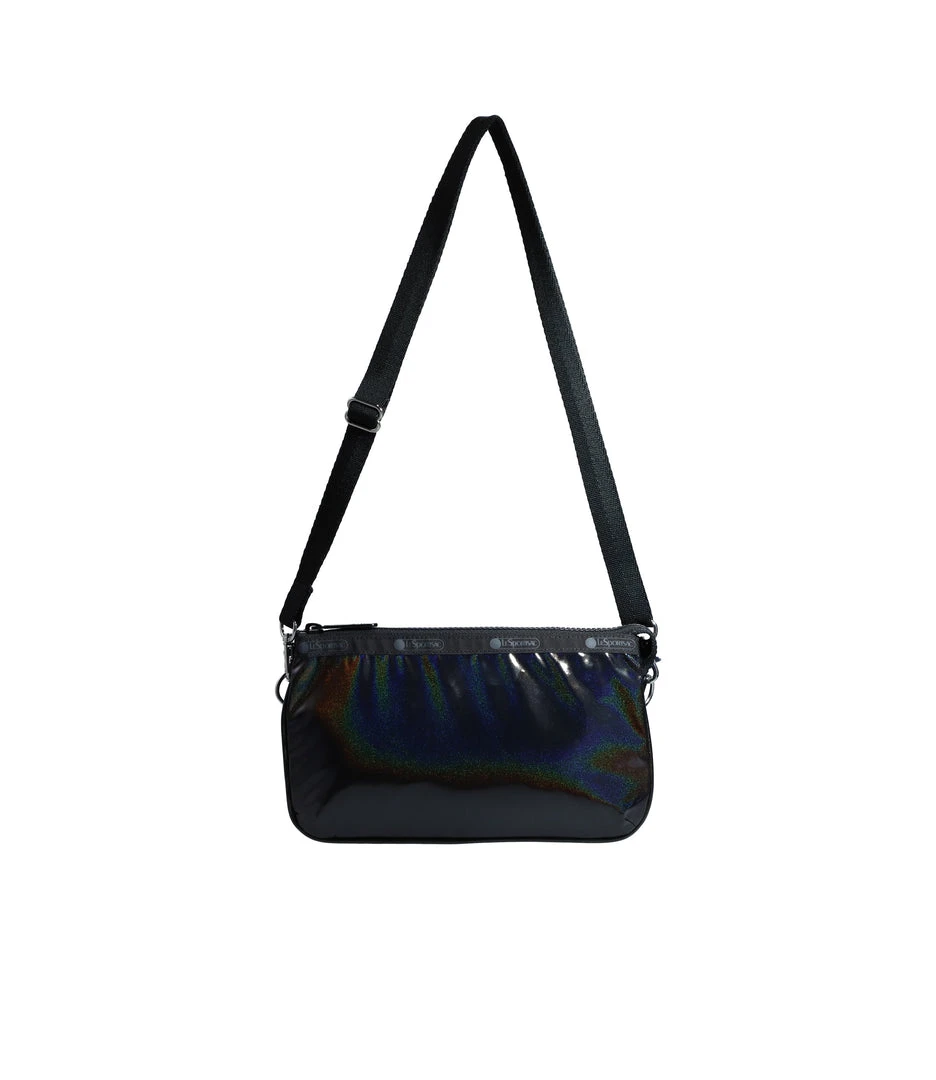 Zip top closure with two main interior compartments, Interior center zip divider pocket with two open pockets on either side, Interior back wall combination zip/open pocket, Two strap options: Adjustable/detachable crossbody strap (0.75in/ 1.91cm wide with a maximum extension of 50in/127cm) and a detachable wristlet strap (1in/2.54cm wide and 6.5in/16.5cm length around), Metal hardware