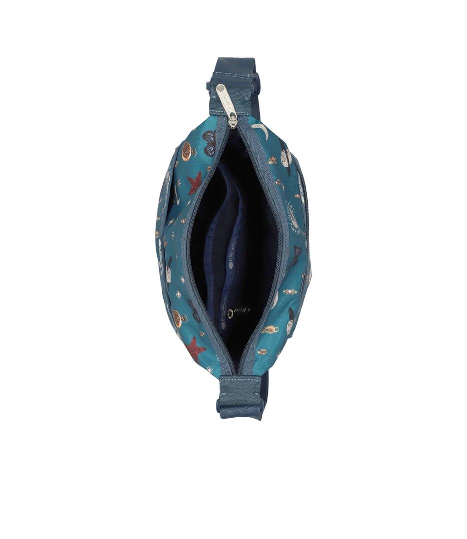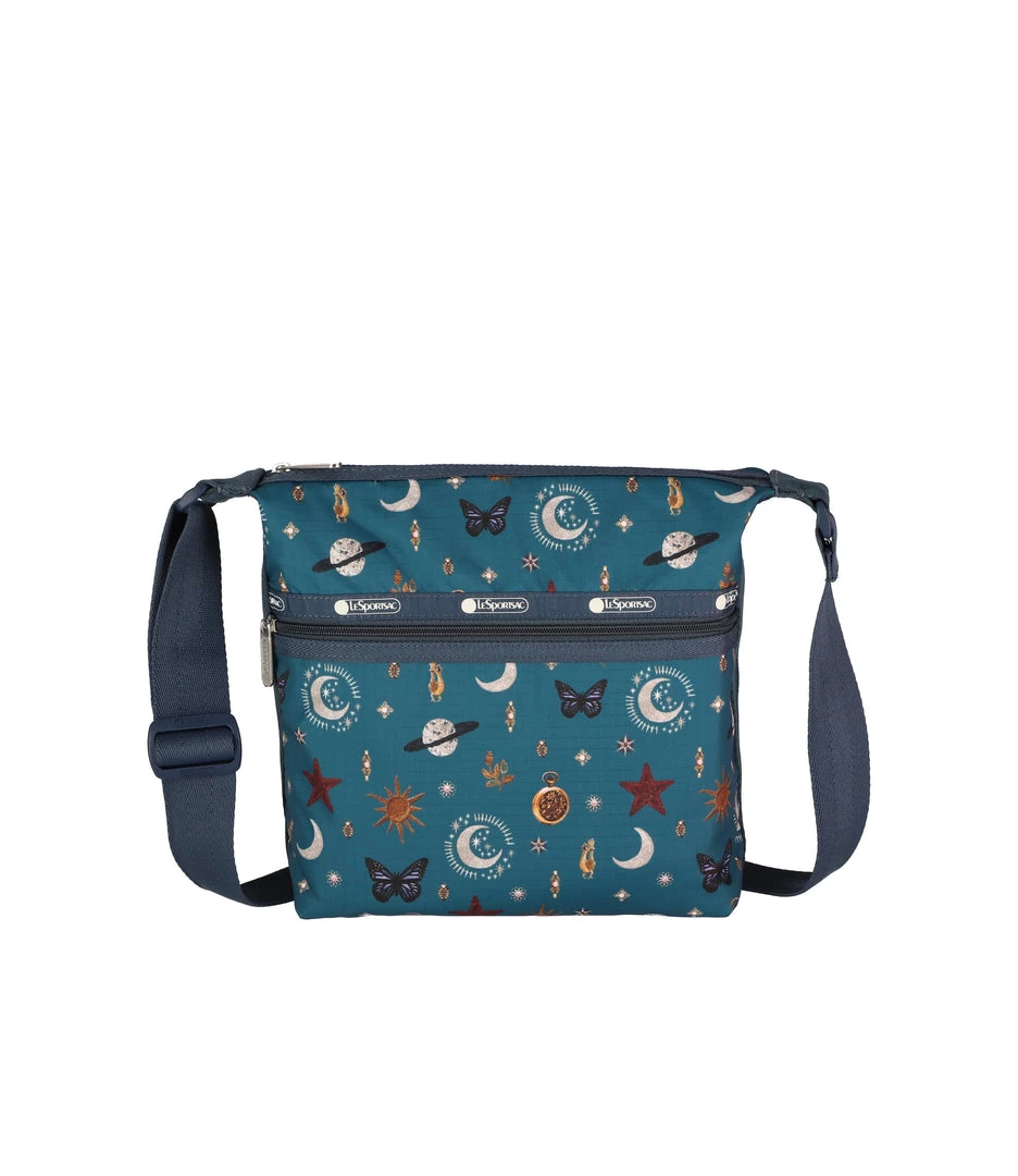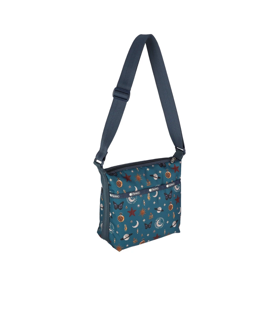 Zip main closure, Exterior front pocket with zip closure, Exterior back open pocket with magnetic snap closure, Two Interior front wall open pockets, Interior back wall features a combination zip/open pocket and a larger open pocket, 1.5 in/3.8cm wide adjustable shoulder strap (Max length: 53 in/134.5 cm, Min length: 30.3 in/ 77 cm)9.25H x 9.25W x 4.5D in, 23.5H x 23.5W x 11.5D cm