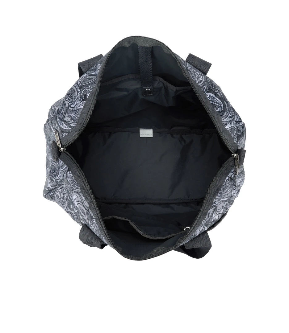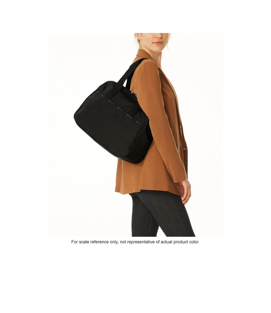 Zip main closure with dual zipper pulls, 8.5in (21.59cm) Handle drop, Exterior front pocket with zip closure, Exterior back pocket with bottom zipper to convert into a sleeve (to slide over rolling luggage handles), Adjustable/detachable shoulder strap (Max. 51.5in/130.81cm) with plastic hardware, Interior front wall zip closure pocket, Interior back wall laptop compartment (fits laptops up to 15in)