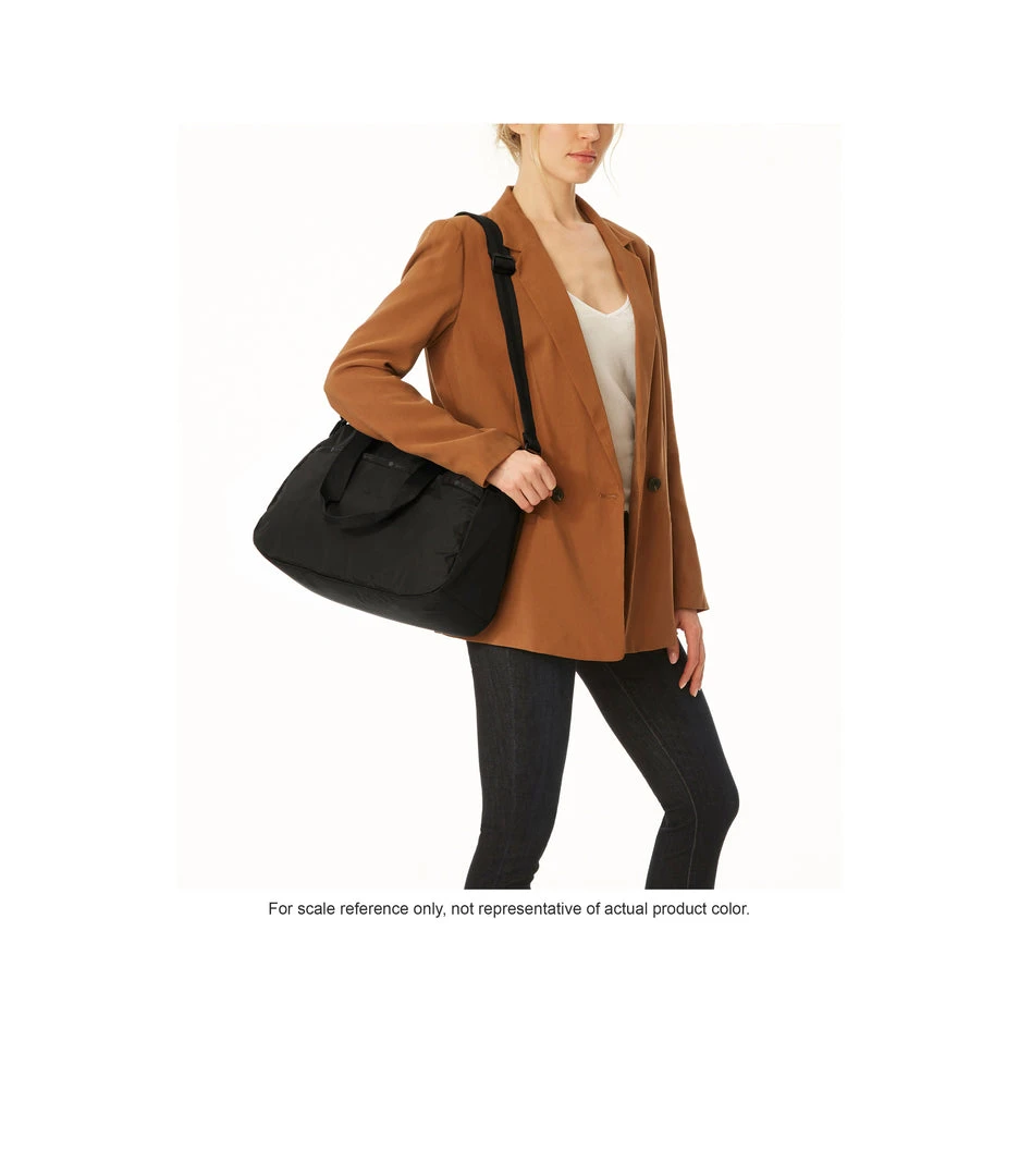 Zip main closure with dual zipper pulls, 8.5in (21.59cm) Handle drop, Exterior front pocket with zip closure, Exterior back pocket with bottom zipper to convert into a sleeve (to slide over rolling luggage handles), Adjustable/detachable shoulder strap (Max. 51.5in/130.81cm) with plastic hardware, Interior front wall zip closure pocket, Interior back wall laptop compartment (fits laptops up to 15in)