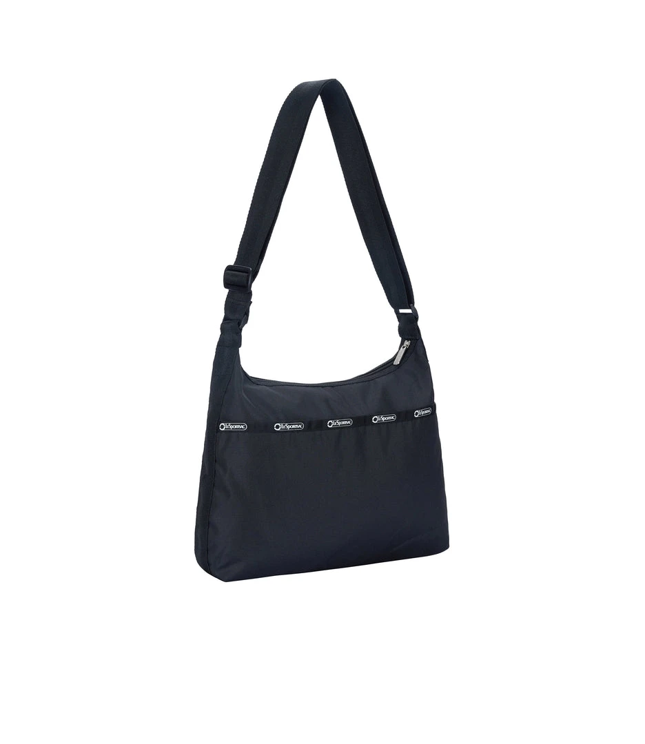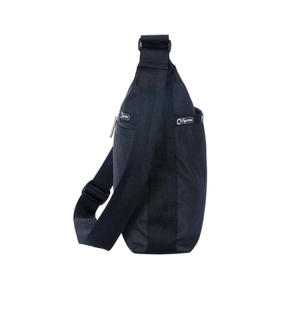 Made using 2.6 recycled plastic bottles, Zip main closure, Exterior front pocket with dual zip closure, Exterior back open pocket with magnetic snap closure, Two interior front wall open pockets, Interior back combination zip/open pocket with key loop on top of large open pocket, 1.5 in/3.8cm wide adjustable shoulder strap (Max length: 26.2 in/66.5 cm, Min length: 16.7 in/ 42.5 cm)