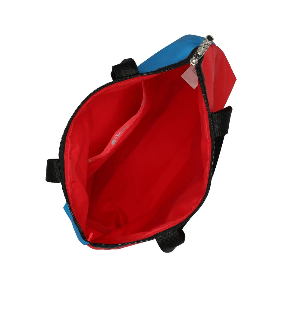 Zipped main closure, 1in (2.5cm) wide top handles (Length: 24.6 in/62.5 cm), Interior back wall combination zip/open pocket