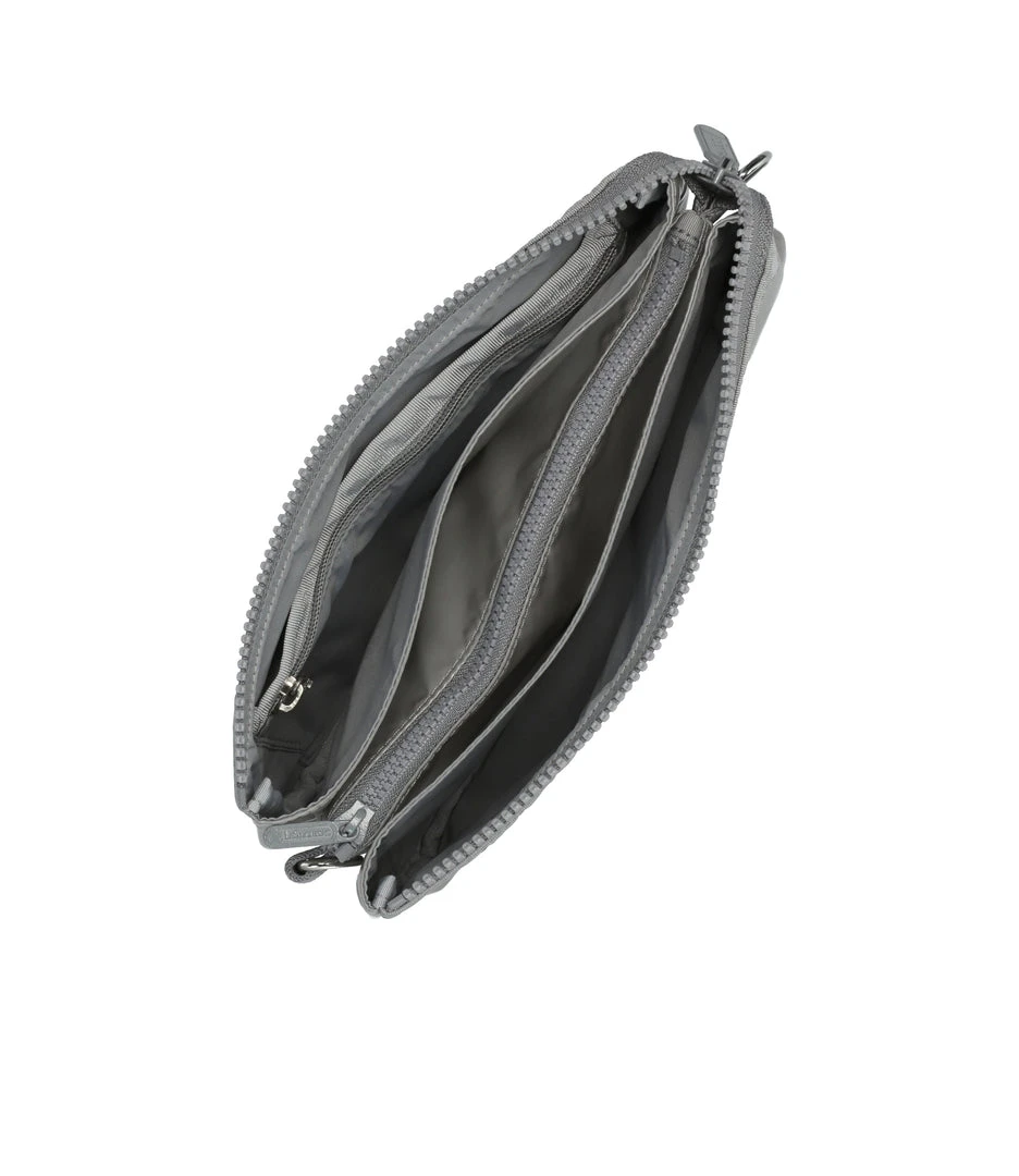 Zip top closure with two main interior compartments, Interior center zip divider pocket with two open pockets on either side, Interior back wall combination zip/open pocket, Two strap options: Adjustable/detachable crossbody strap (0.75in/ 1.91cm wide with a maximum extension of 50in/127cm) and a detachable wristlet strap (1in/2.54cm wide and 6.5in/16.5cm length around), Metal hardware