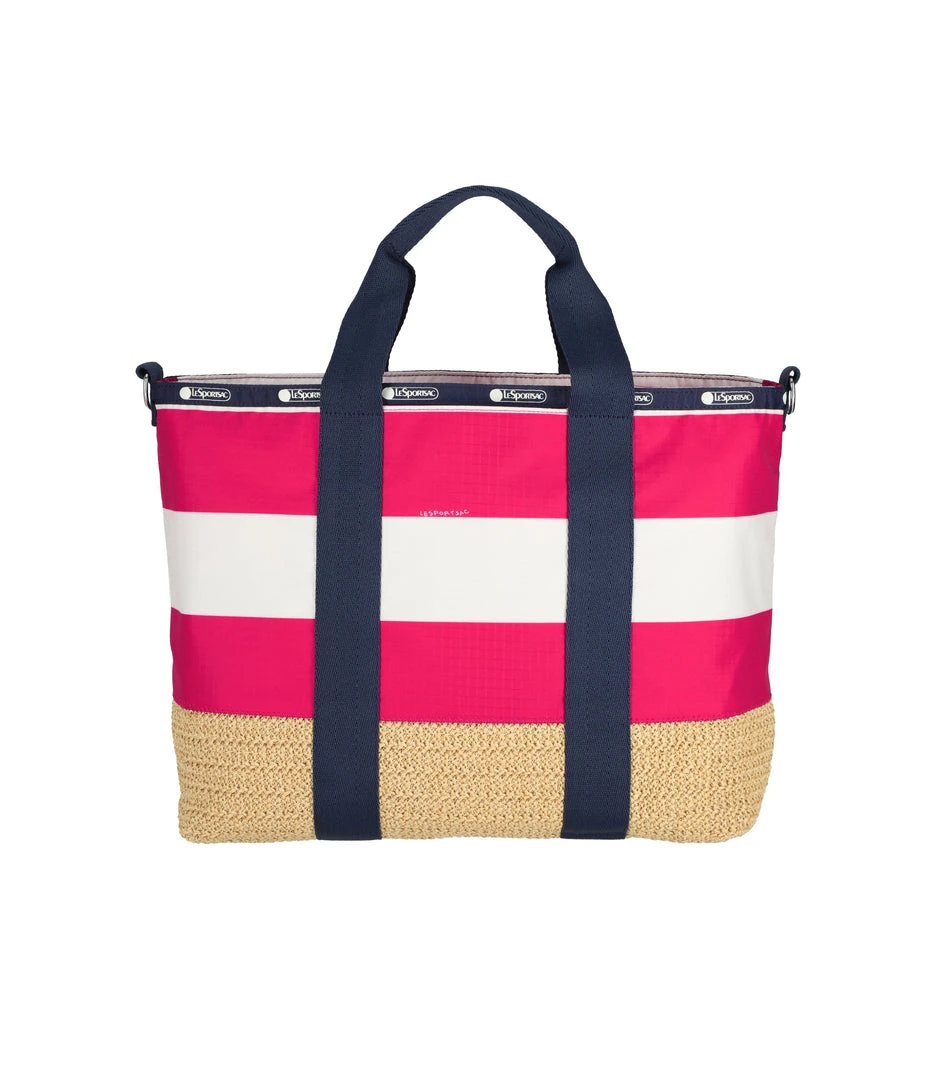 Features straw construction on the lower half of the bag. Please spot clean only, as continuous washing or rough treatment may cause damage.