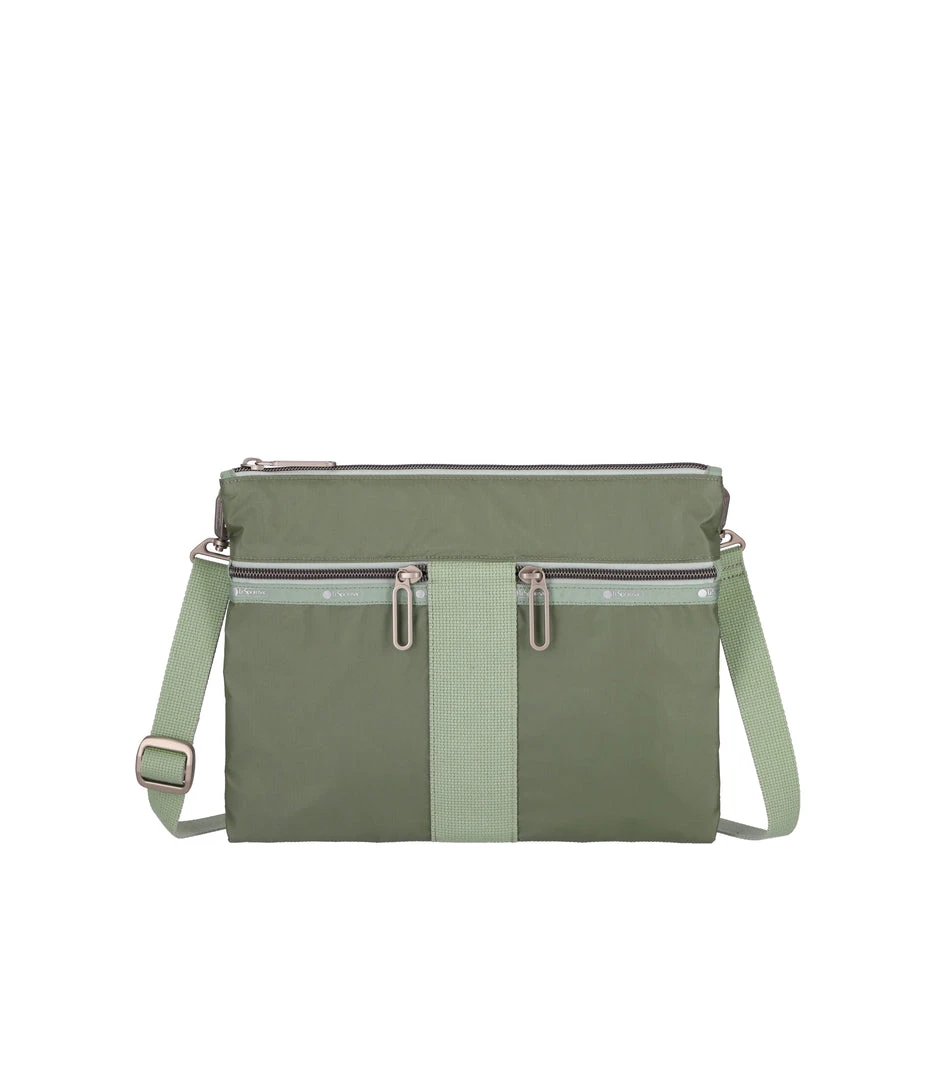 Zip top main closure, Adjustable/detachable crossbody strap (Max. 50in/127cm), Two exterior front pockets with zip closures, Two exterior back panel open pockets, Interior back wall zip closure pocket, Two interior front wall open pockets