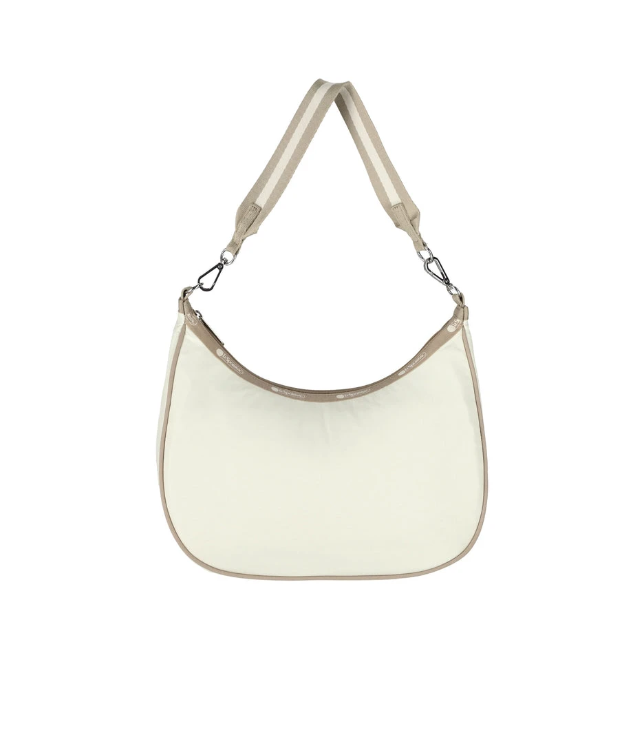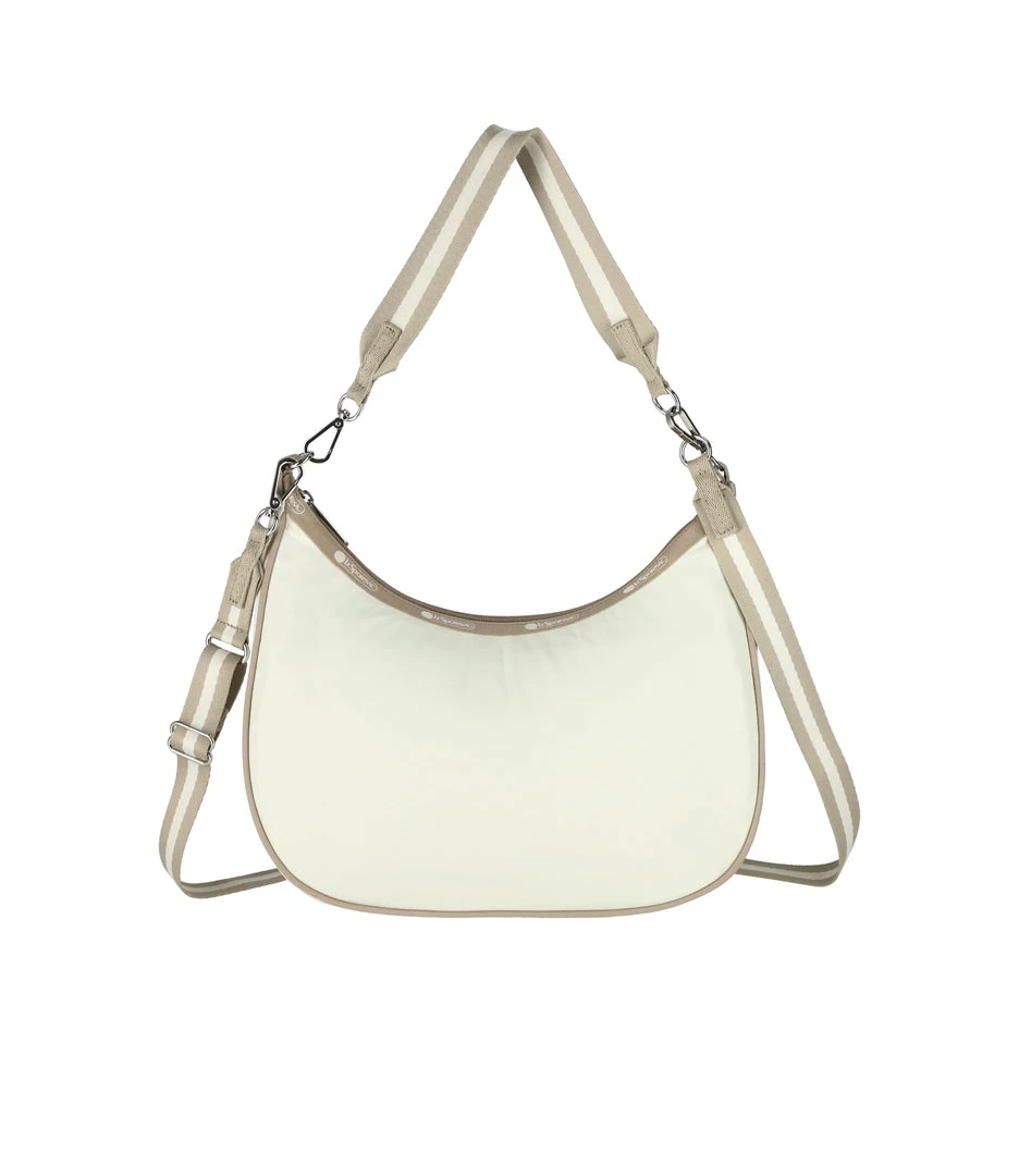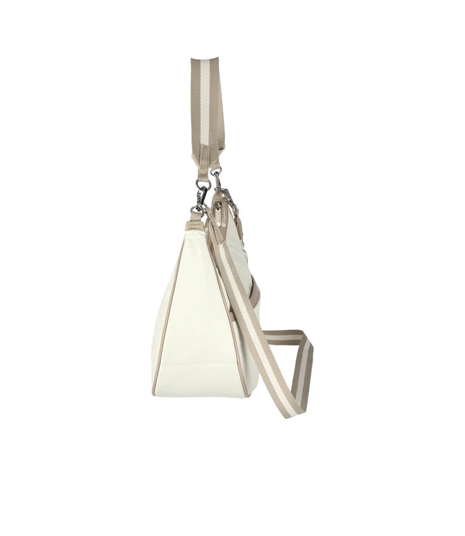 Zip top main closure, Exterior back pocket with zip closure, Interior front wall open pocket, Interior back wall combination zip/open pocket, Two detachable strap options:Â Short Strap – 1.5in/3.8cm wide non-adjustable strap (with a drop of 5.75in/14.6 cm and a length of 17.75in/45 cm) and Long Strap – 1in/2.5cm wide adjustable/detachable crossbody strap (min length: 24.8 in/63 cm and max length: 42.5 in/108 cm, ), Metal hardware