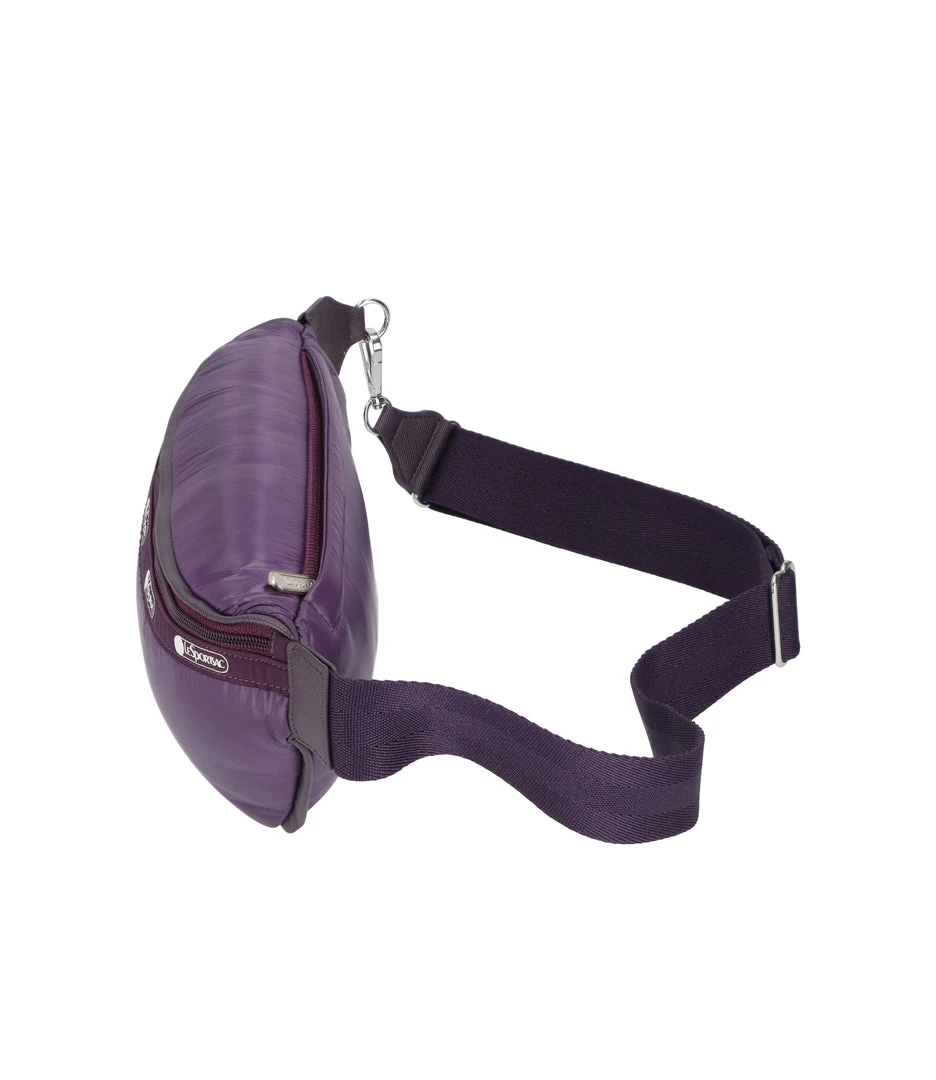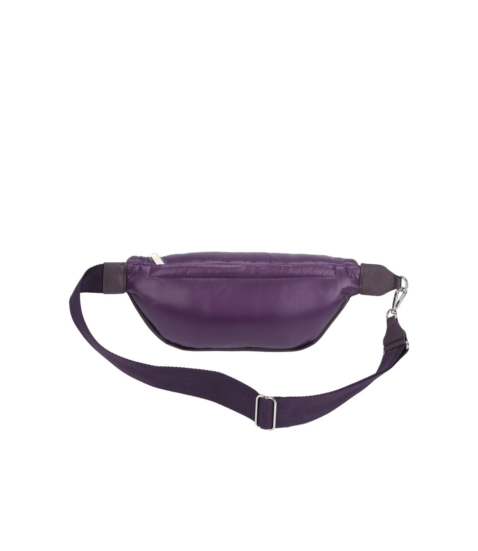 Zip closure front main compartment, Exterior back panel zip closure pocket with 3 credit card slots on interior back wall, 1.5in/3.8cm wide adjustable waist belt with a minimum length of 36 in/91.5 cm and maximum length of 50.75in/129 cm (measurements include length of bag body and clip), Metal hardware, Vegan-leather trim details, Piped edges for added structure