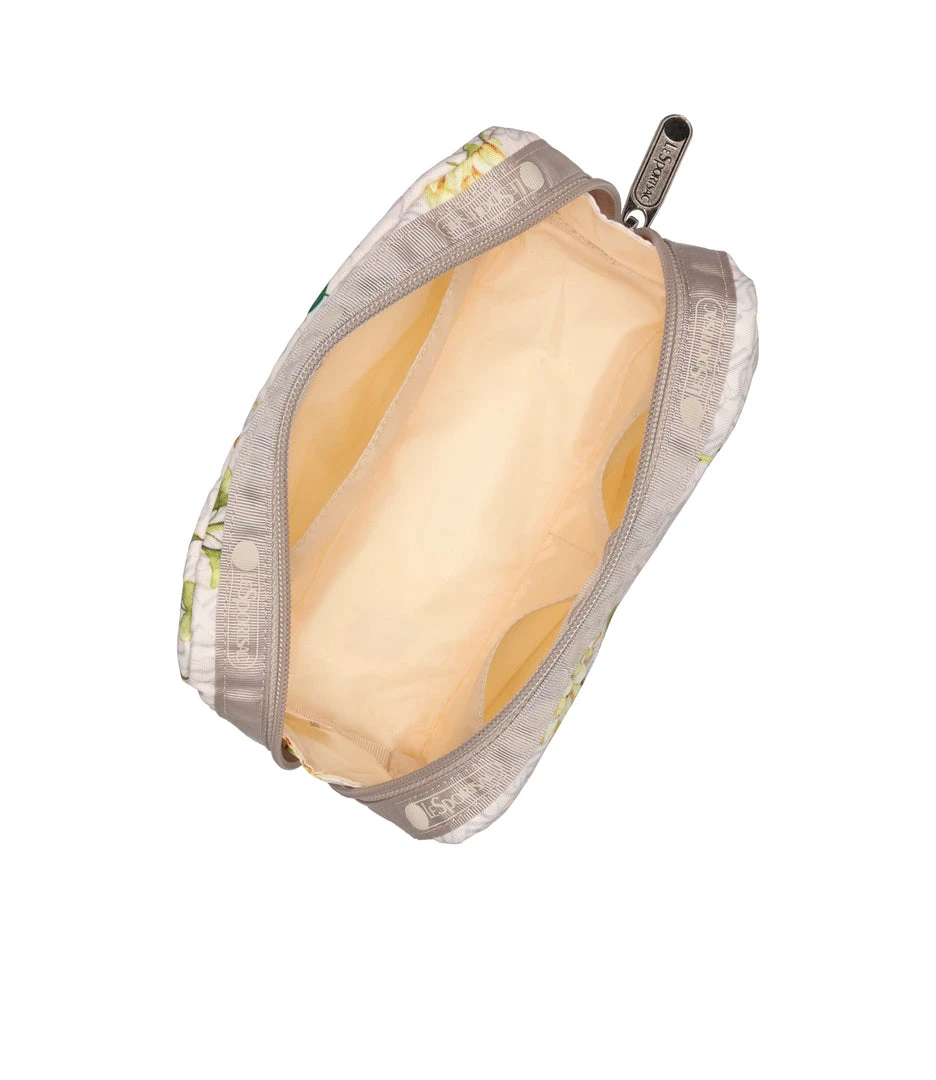 Zipped main closure, Interior back wall open pocket, Two interior front wall open pockets