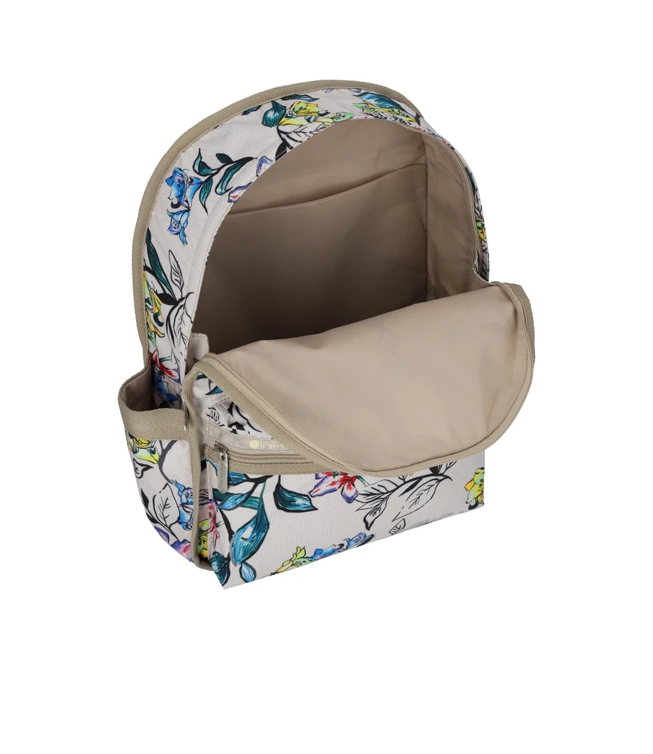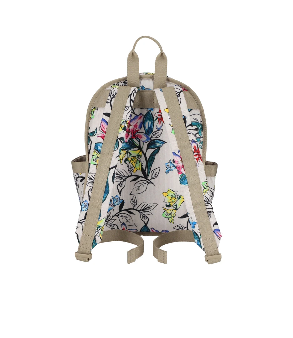 Zip main closure with dual zipper pulls, Exterior front zip closure pocket, Exterior top back open pocket (behind the shoulder straps), Interior back wall open pocket, 1in/2.5cm wide top handle (Drop: 3 in/7.5cm, Length: 10.43 in/26.5 cm), 1in/2.5cm wide adjustable shoulder straps (Max length: 28 in/71 cm)