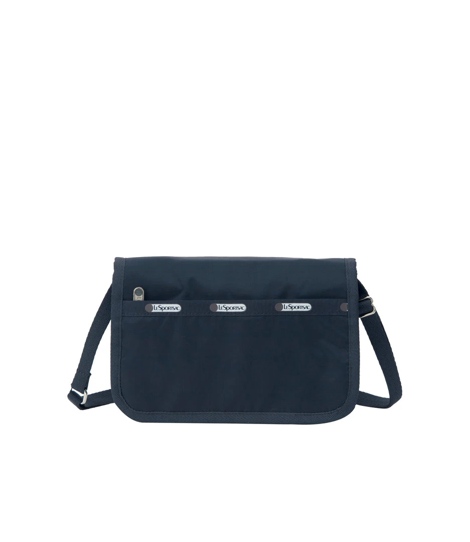 Exterior front zip pocket, Magnetic snap closure under flap, Exterior back pocket with hidden magnetic snap closure, 0.5 in/1.27cm wide snap-off detachable crossbody strap (Max length 50in/127cm), Two interior compartments with zip closures, the rear interior zip compartment has a back wall open pocket