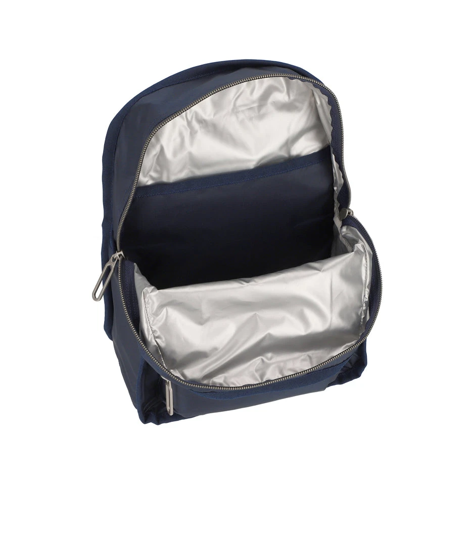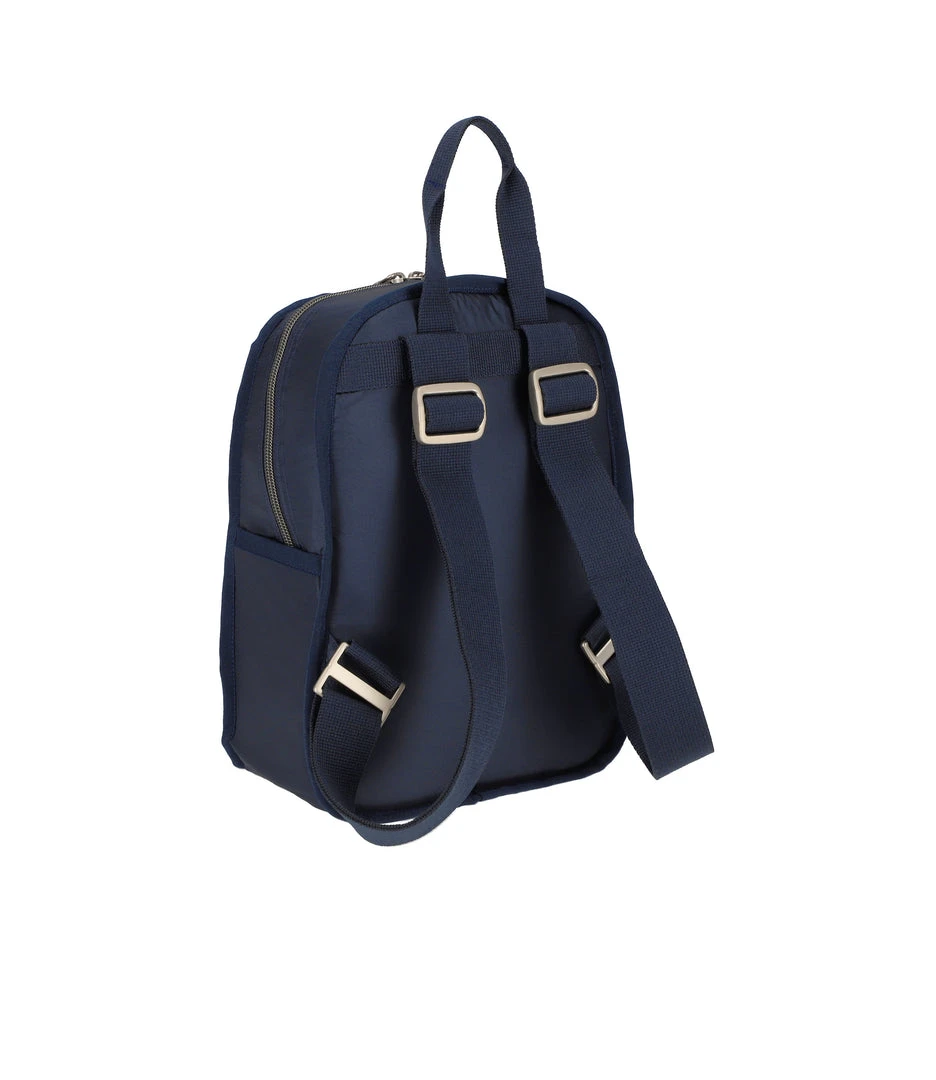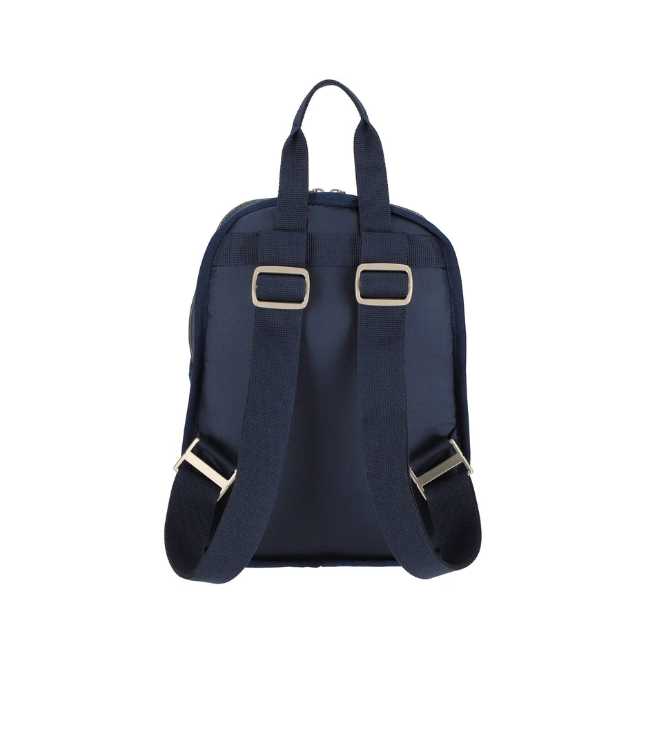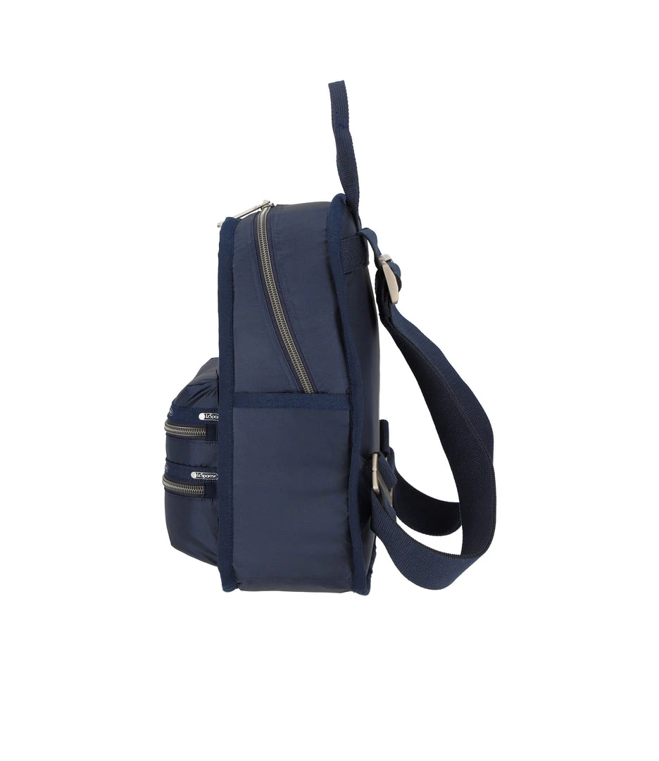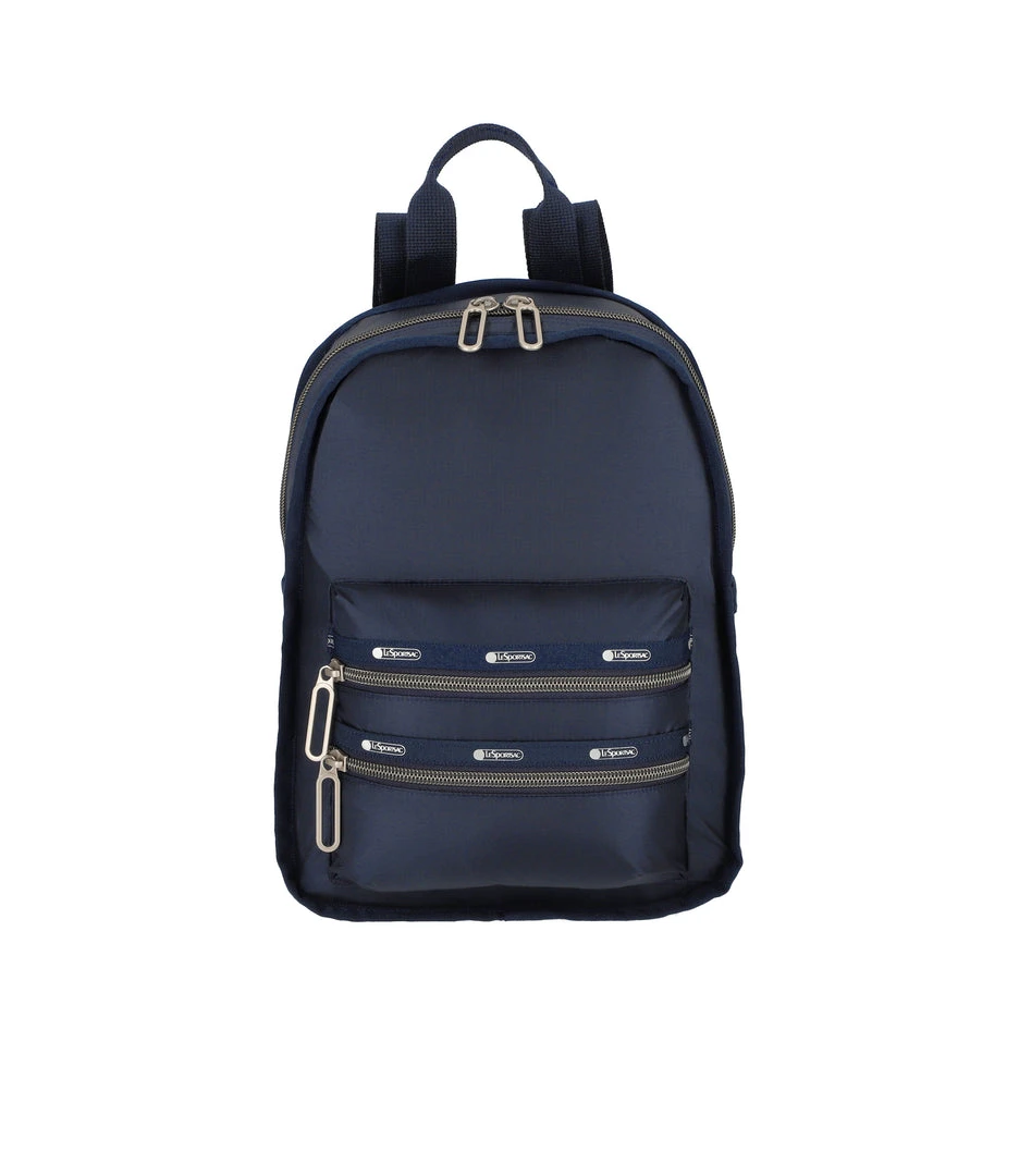 Zip main closure with dual zipper pulls, Two exterior front pockets with zip closures, Adjustable webbing shoulder straps, Top loop handle, Interior back wall open pocket