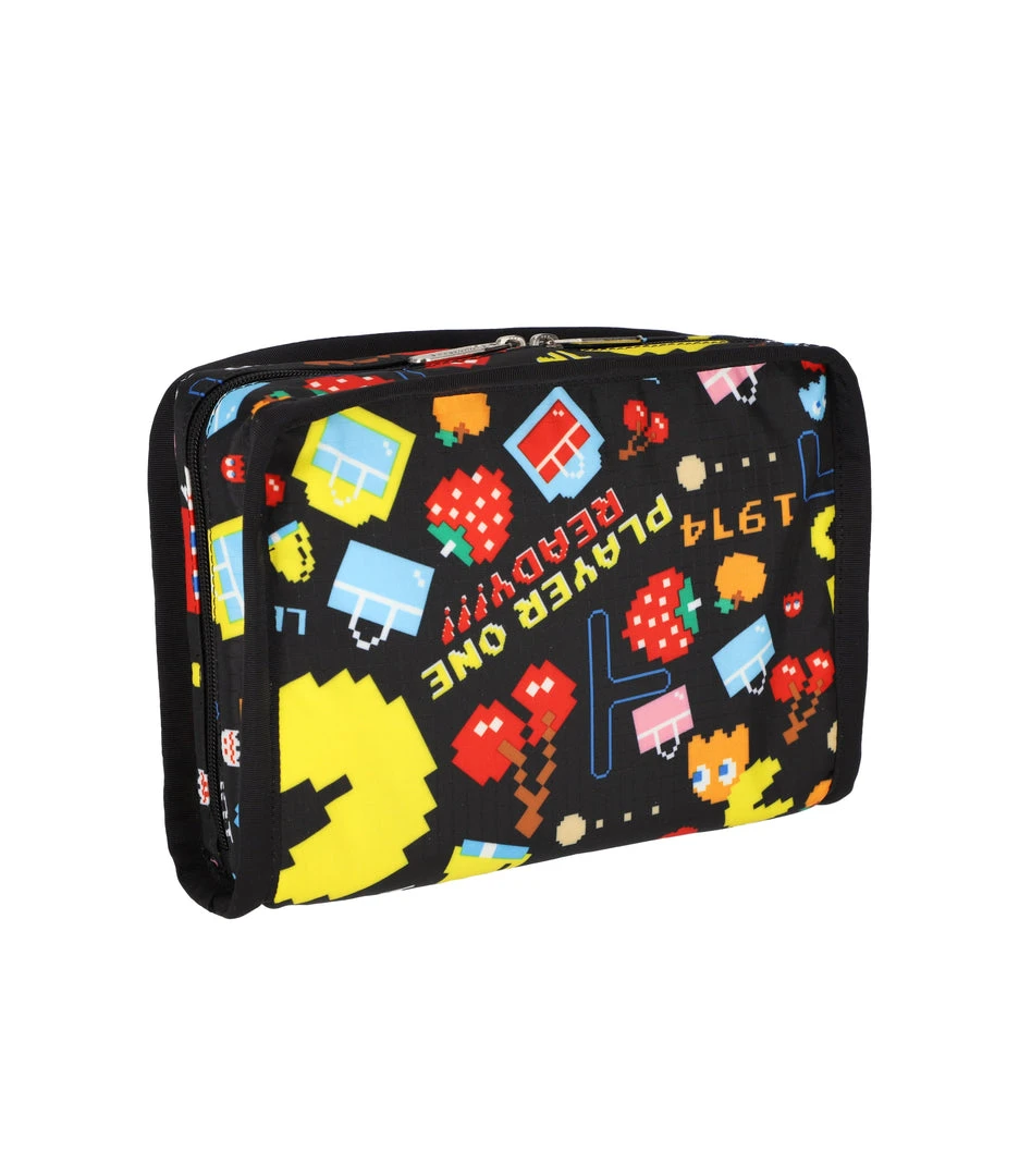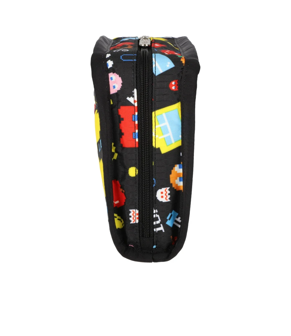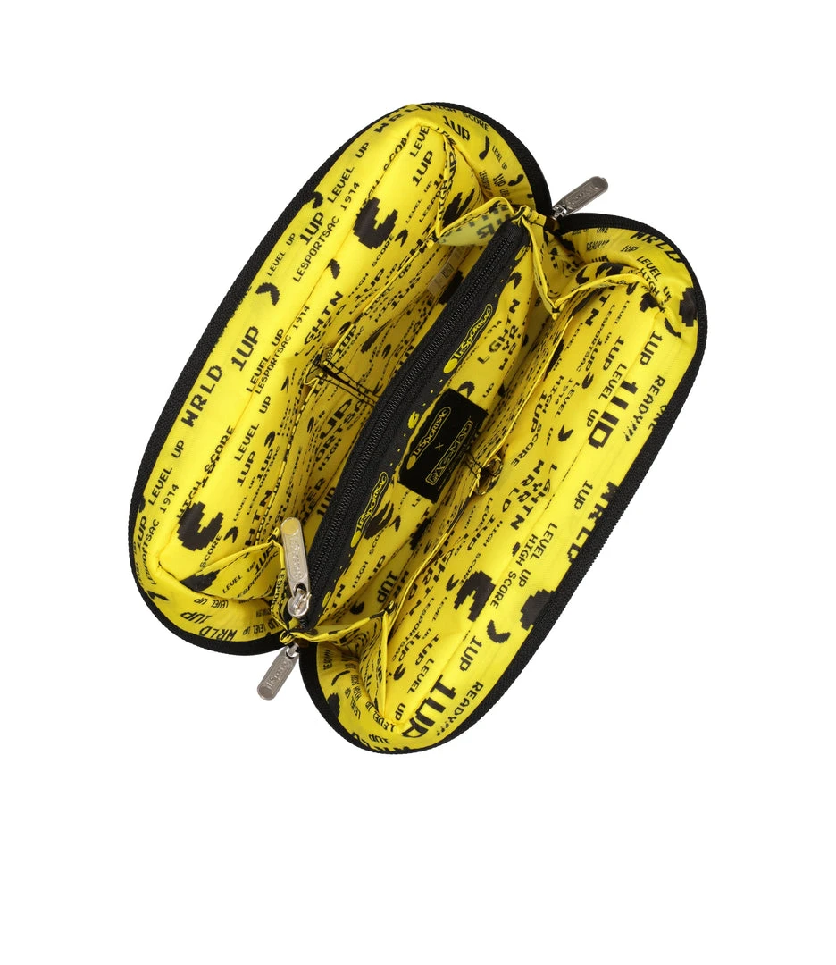 Zip main closure, Exterior front zip pocket, Interior center zip pocket, Four interior open pockets