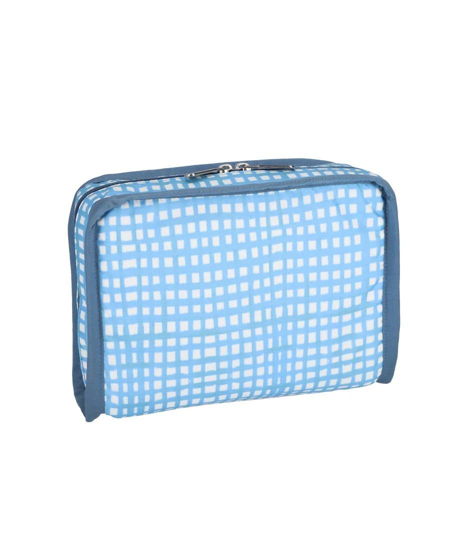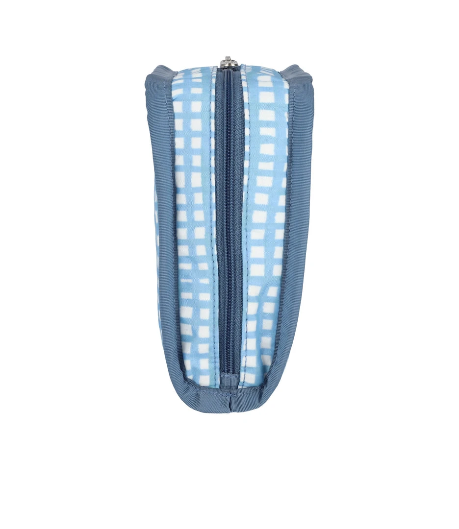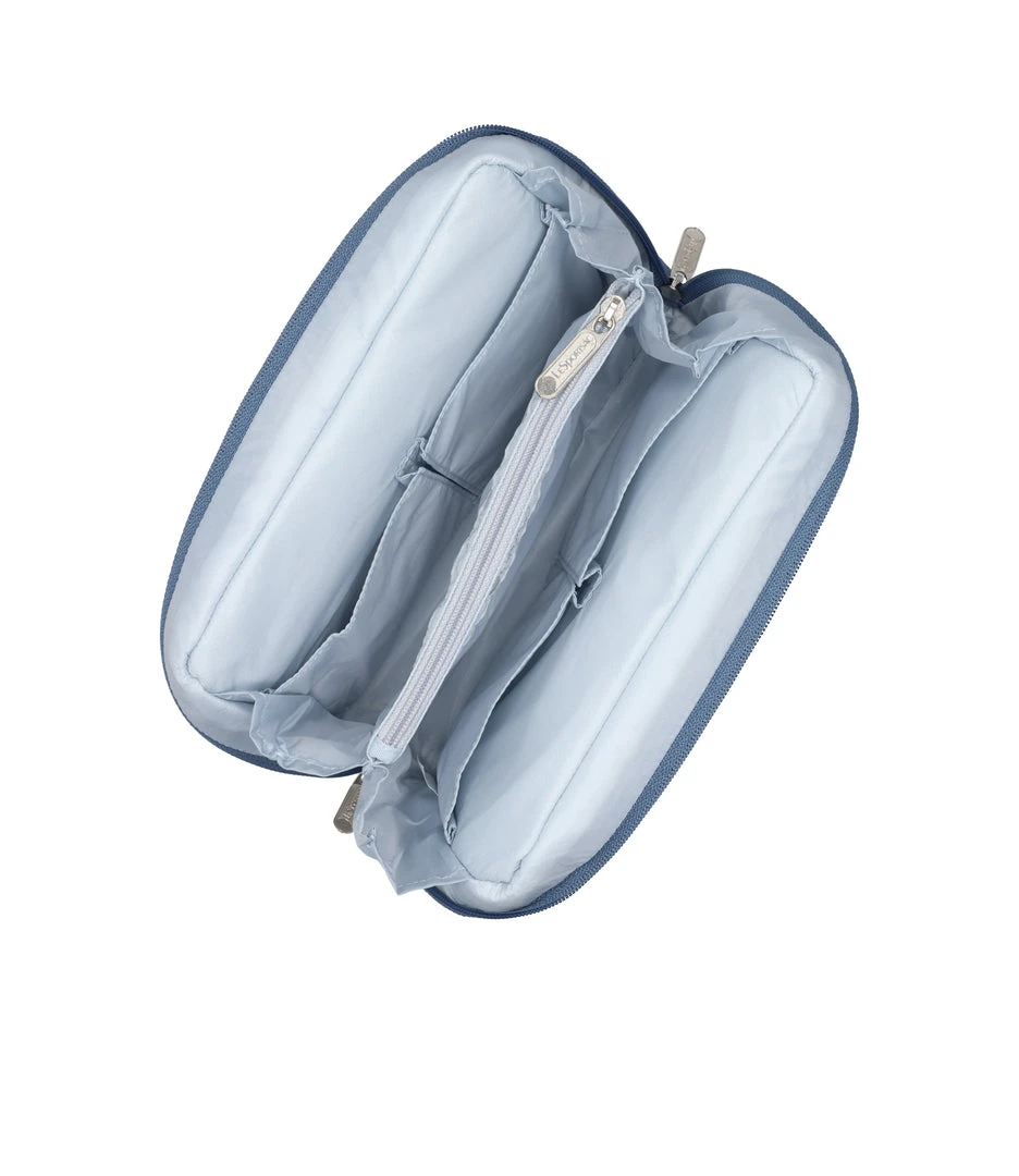 Zip around main closure with dual zipper pulls, Exterior front zip pocket, Interior center zip pocket, Four interior open pockets