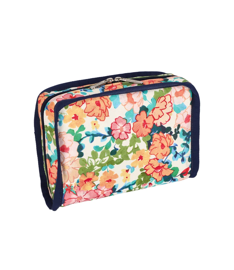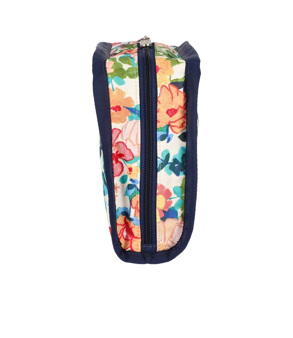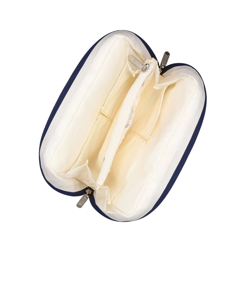 Zip around main closure with dual zipper pulls, Exterior front zip pocket, Interior center zip pocket, Four interior open pockets