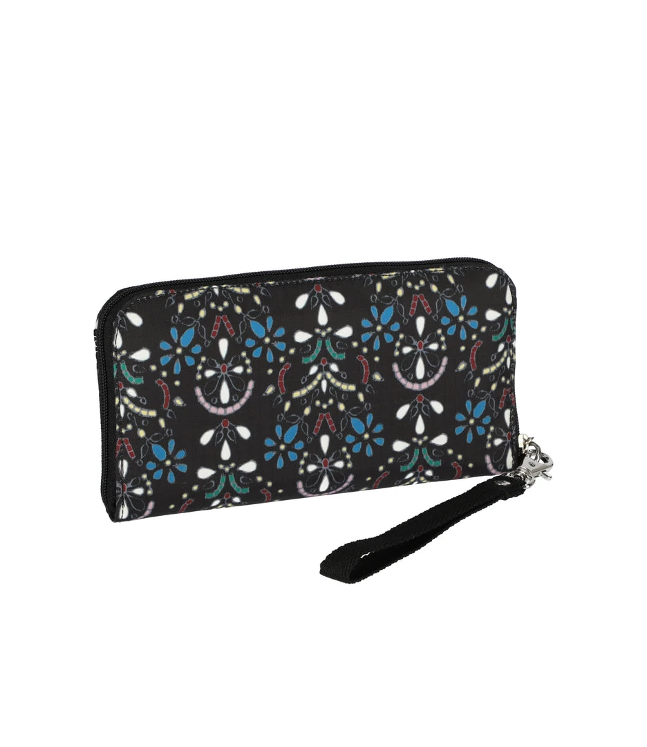 Zip around main closure, Exterior front open pocket, Detachable wristlet strap (0.5in/1.3cm wide webbing strap with a total loop length of 6.5 in/16.5 cm from end to end), Interior features eight total card slots and two full-length bill pockets, Interior center zip closure pocket for coins, Interior open cell phone pocket, Two Interior gusset pockets (to hold receipts, pens or additional paper currency)3.9HÂ x 7.9W x 0.8D in, 10H x 20W x 2D cm