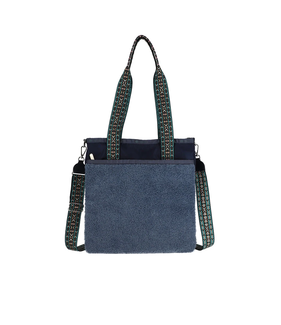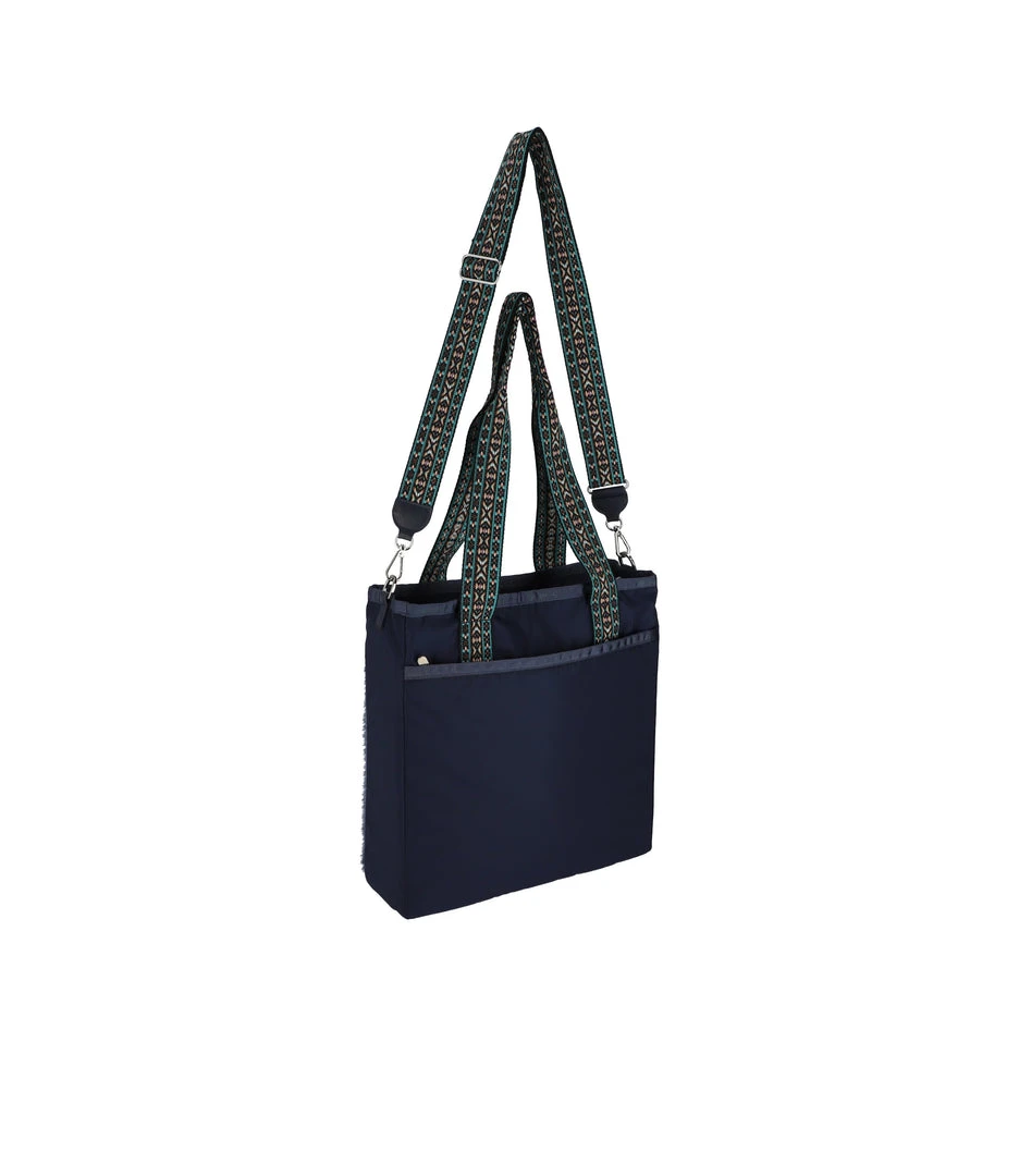 Zipped main closure, Exterior back panel zip pocket, Interior back wall open pocket,1.5in/3.8cm wide pinched top handles (Drop:11 in/ 28 cm, Length: 26.6in/ 67.5 cm), 1.5in/3.8cm wide adjustable/detachable shoulder strap (Min length: 28.5in/72.5 cm, Max length: 52in/132cm), Vegan-leather trim details, Metal hardware